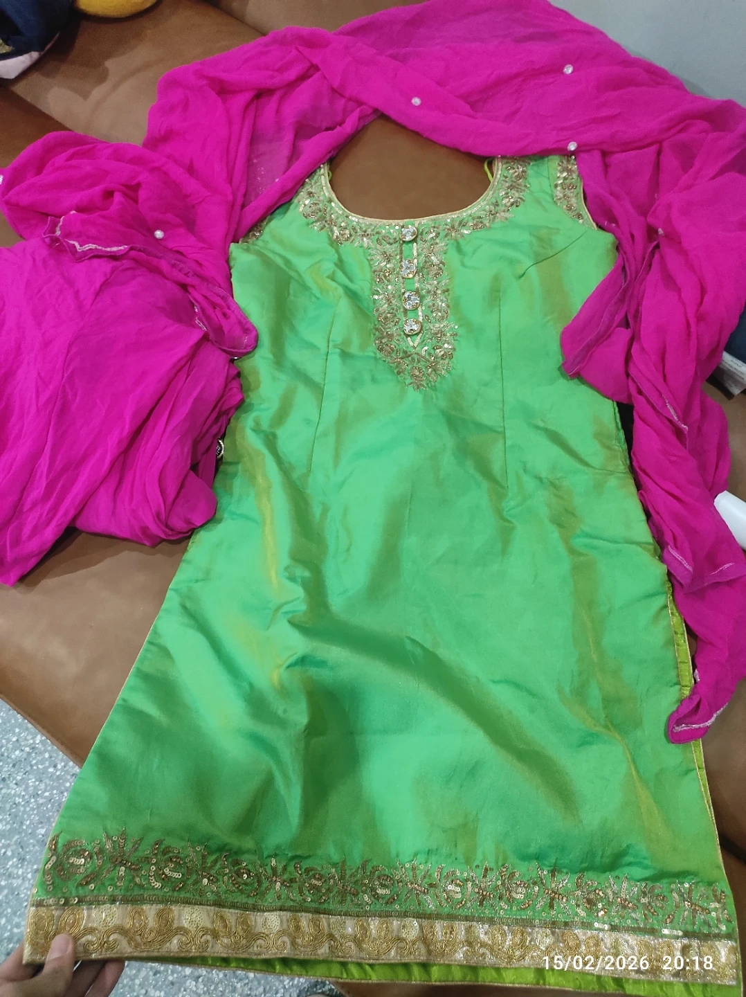 This is a vibrant green salwar kameez set. It's adorned with intricate gold embroidery and sequins around the neckline and hem. A bright pink dupatta complements the outfit. Material is silk.