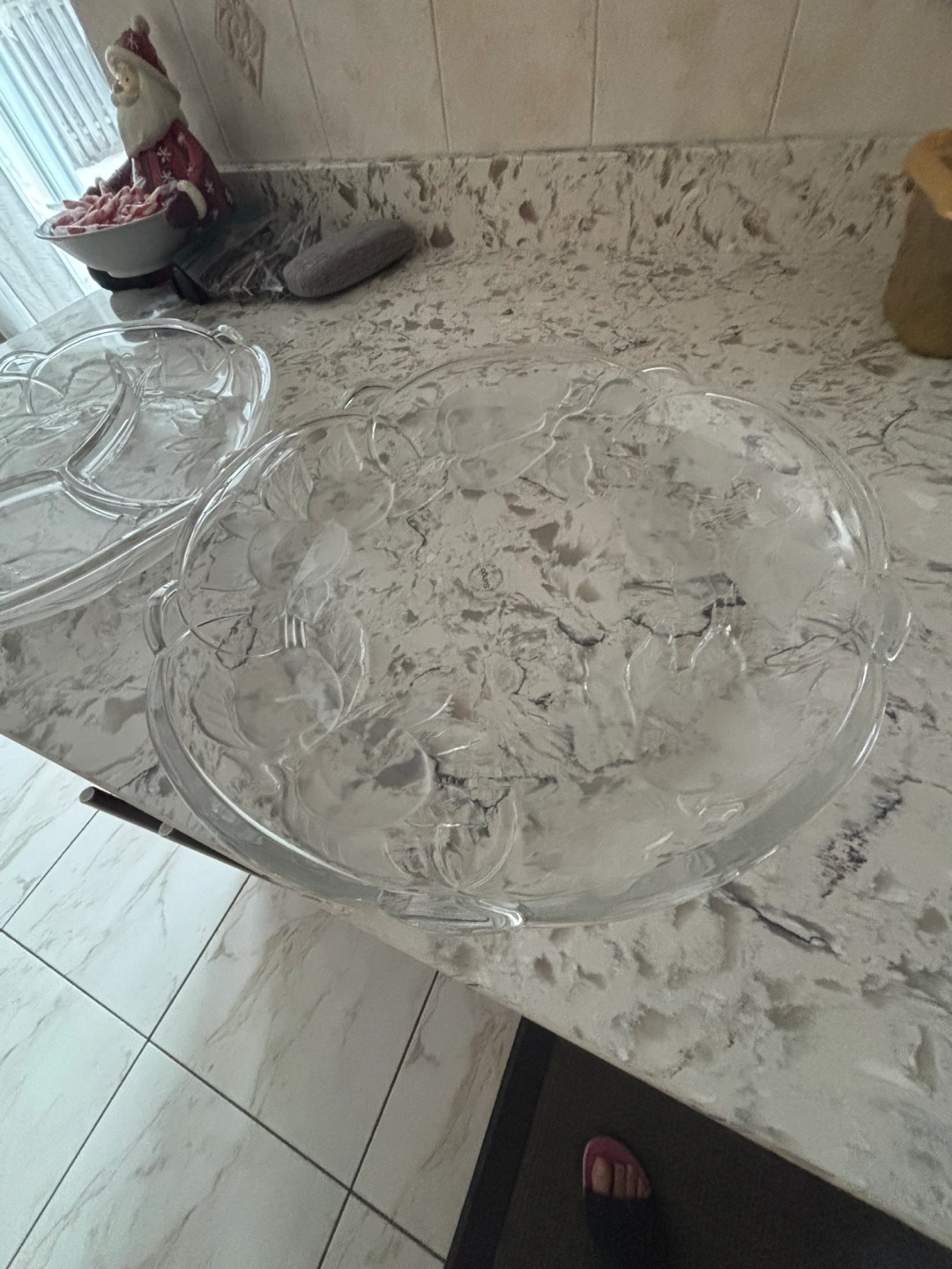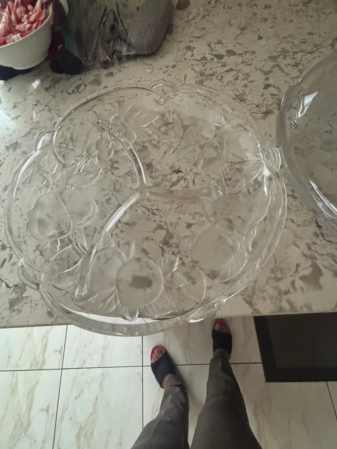 Beautiful, clear crystal serving platter. Four sections, perfect for snacks or appetizers. Etched fruit design. Vintage. Great condition.