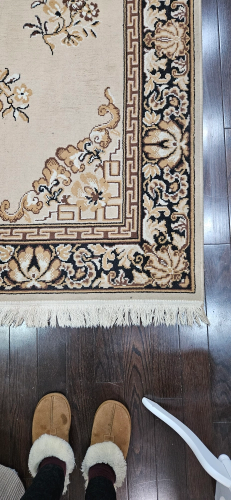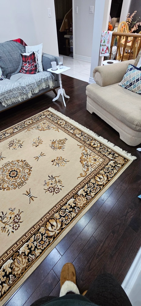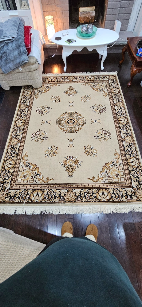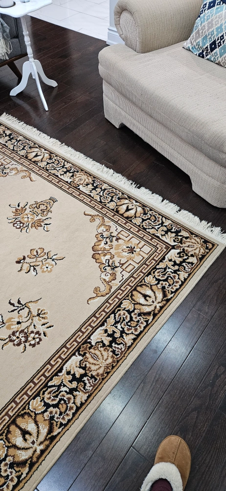 Cream-coloured rug, intricate floral and geometric design. Features a beige background with brown and black accents. Fringed edges. Suitable for living room or dining room.
