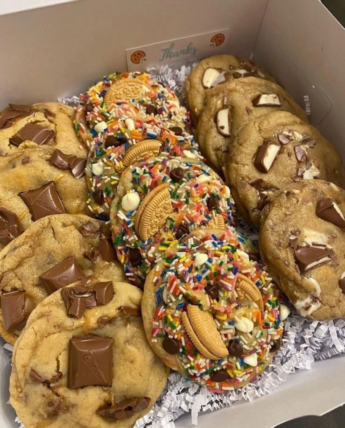 Buy & SellGourmet chunky cookiesGourmet chunky cookies$45Set of 12 thick, soft chunky cookies (4 Cadbury chocolate chip, 4 funfetti golden Oreo, 4 kinder chocolate). 3.75$ per cookie. MADE FRESHWHERE TO MEETCheck LocationView MapSELLERBakedbyCLeitrim292 reviews0 chats·2 favorites·58 views