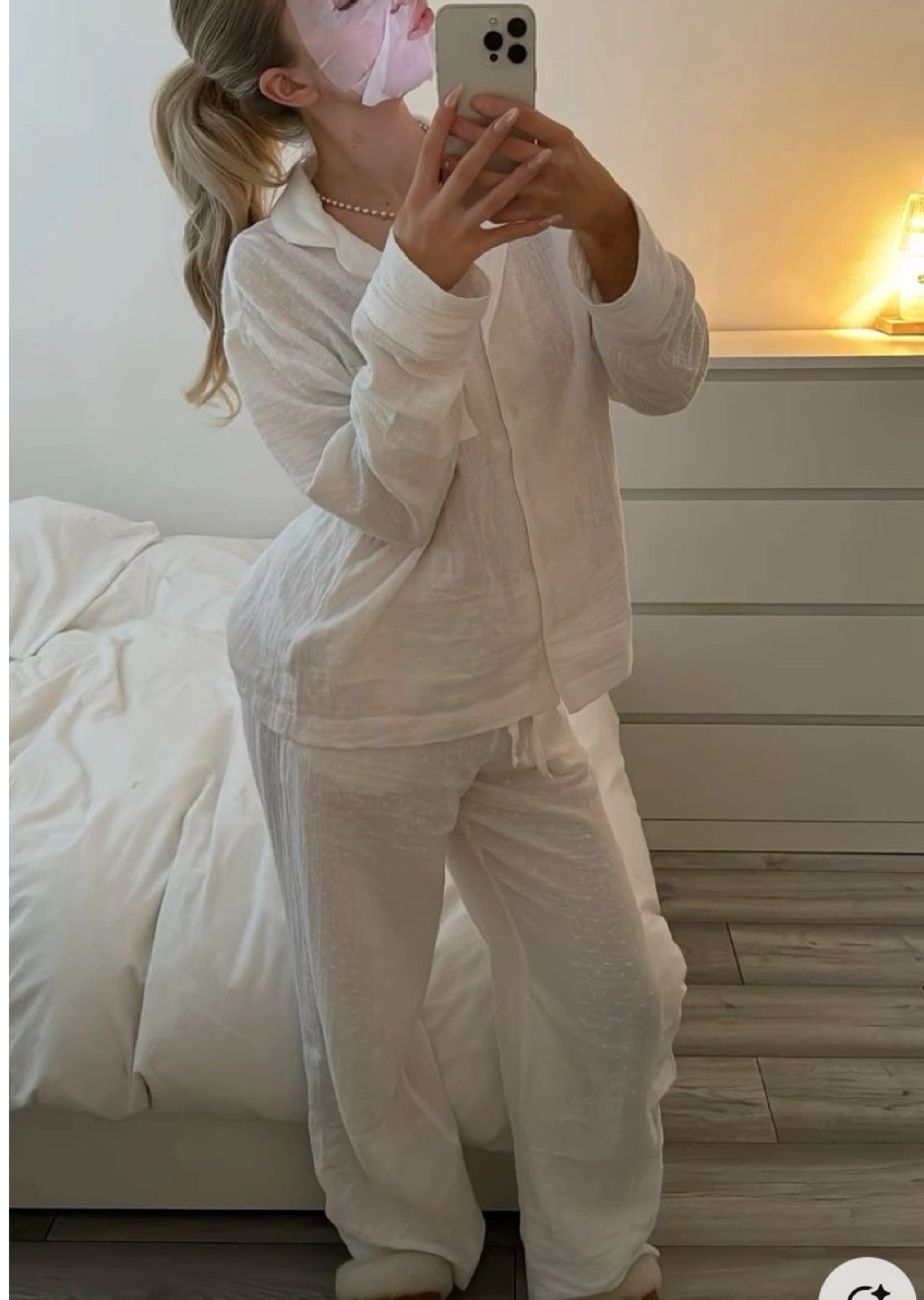 Women's pajama set. White waffle-textured cotton. Long sleeves, collared shirt and drawstring pants. Size XS.