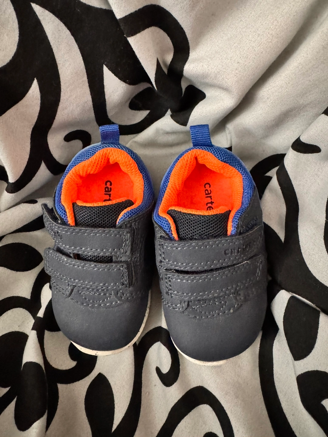 108Infant boy shoes. Size 0-3months. Dark blue with orange and blue accents. Velcro closures. Gently used.