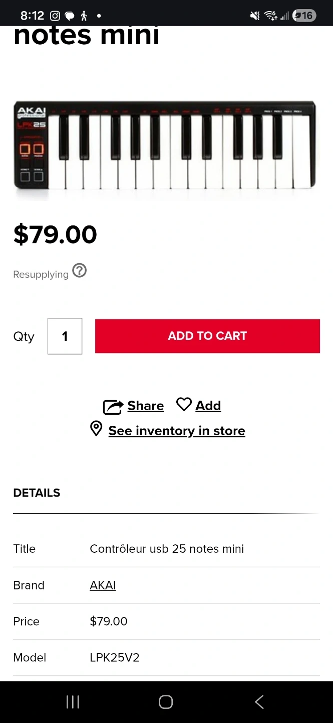 Buy & SellAkai LPK25V2 USB MIDI Keyboard Controller - MiniAkai LPK25V2 USB MIDI Keyboard Controller - Mini$40Selling an Akai LPK25V2 USB MIDI keyboard controller. It's in great shape. Cash only ConditionLike newBrandAkaiWHERE TO MEETCheck LocationView MapSELLERverifiedDrewAlderwood1065 reviews0 chats·1 favorites·11 viewsSEND CHAT TO SELLERHi Drew! I’m interested in your listing.Hi Drew! I’m interested in your listing.Get the Karrot app to chatSign In to chat