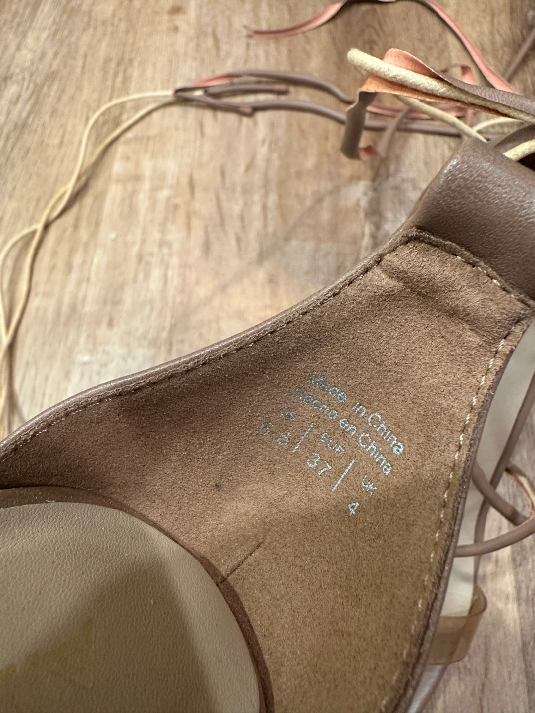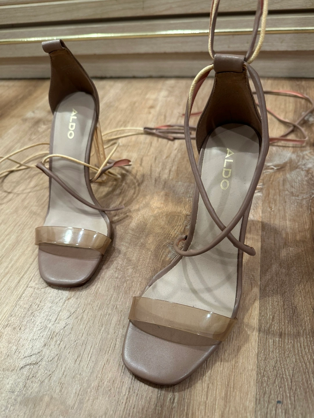 71Beautiful pair of ALDO heels. Tan coloured leather with clear straps. Lace-up design. Size 6.5 The lace for one of them is torn as shown in picture! Pick up only