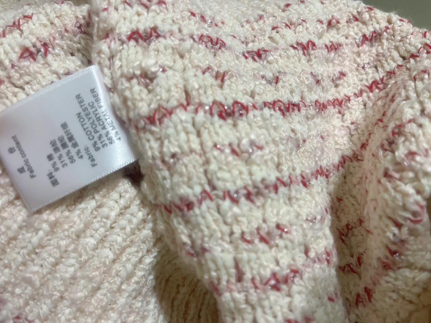 Mix five colors: pink, apricot, red, silver, and white. Featuring a V-neck and exquisite buttons. 59% cotton, 31% polyester, 9% acrylic, 1% other fibers. Wore once.