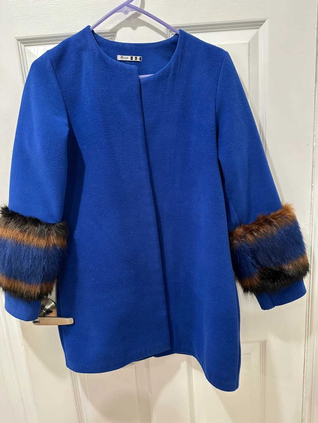 Stylish blue coat. Features long sleeves with faux fur cuffs. Size XL but runs extremely small; I’m size small and fits me. Open front. Lightweight material.