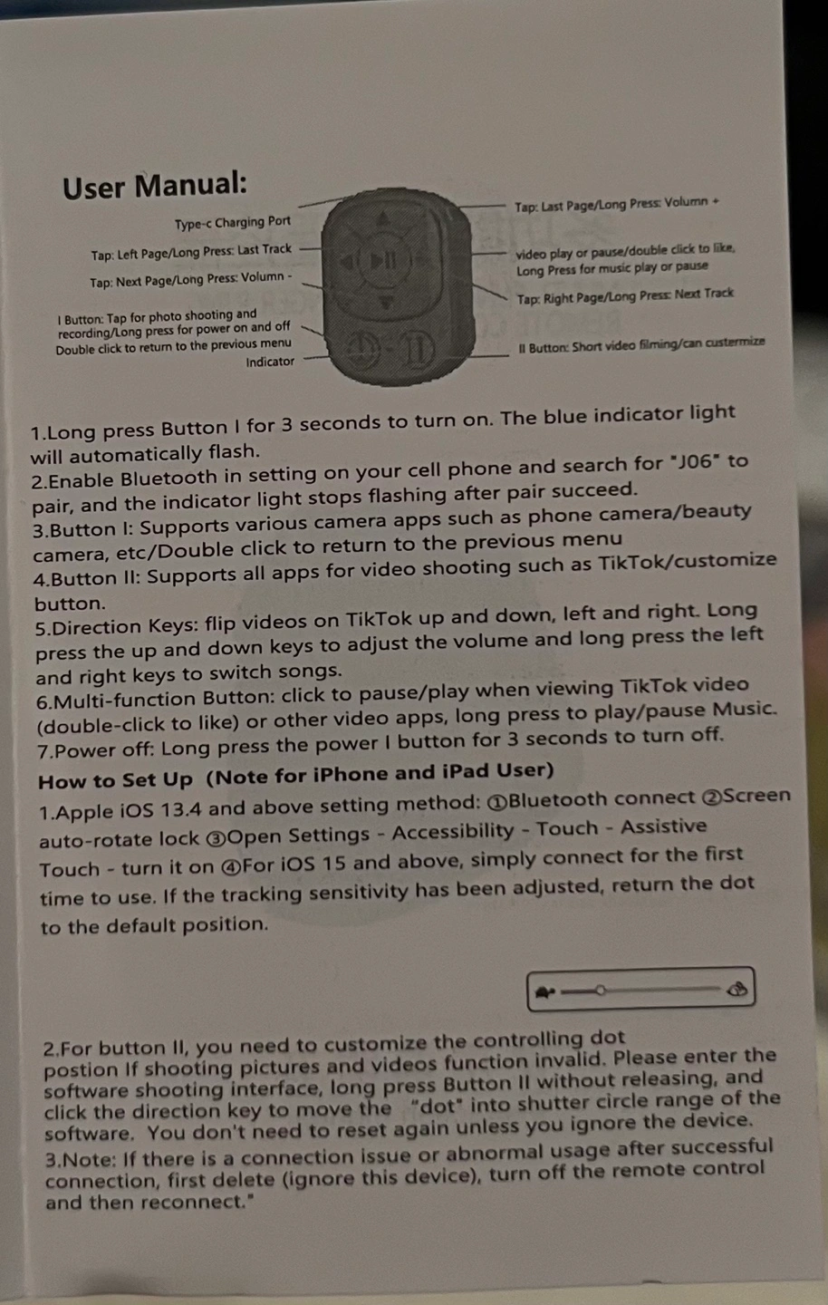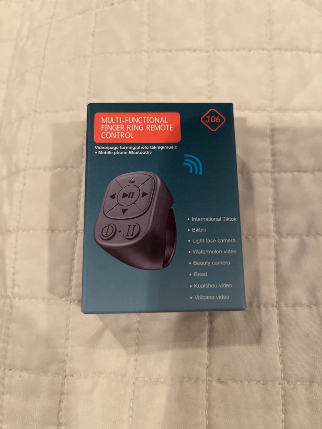 Black bluetooth remote control. Works with mobile phones. Video/page turning/photo taking/music. Compatible with various apps.