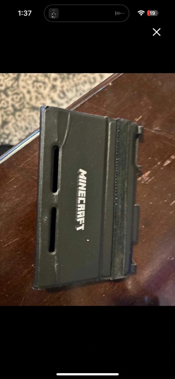 Used Minecraft-themed Nintendo Switch Case. Black exterior. Interior lining features Minecraft designs. Good condition.