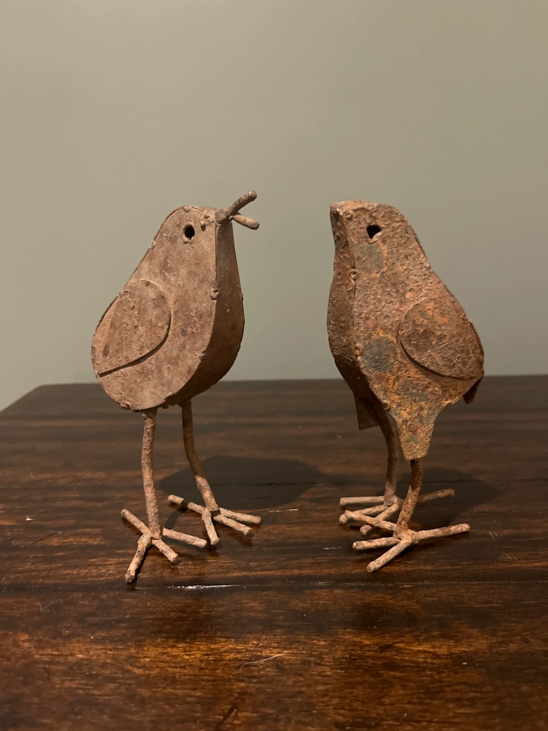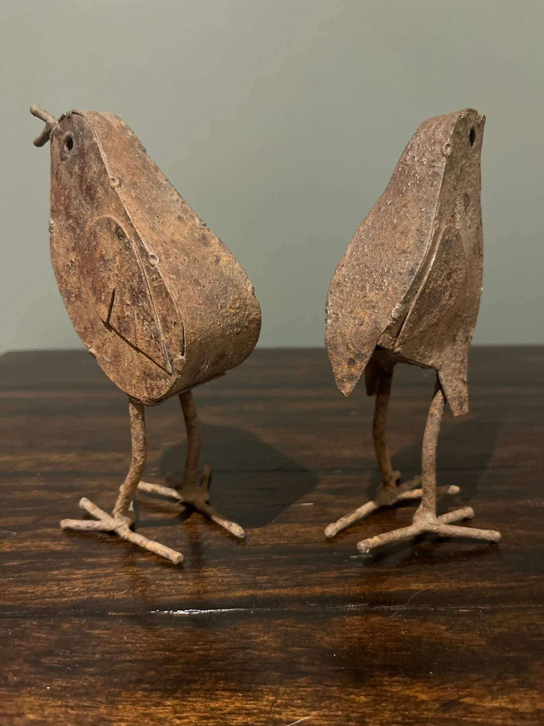 Two charming metal bird figurines. Rustic brown finish. Small size, perfect for a shelf or tabletop. Unique, handcrafted look.