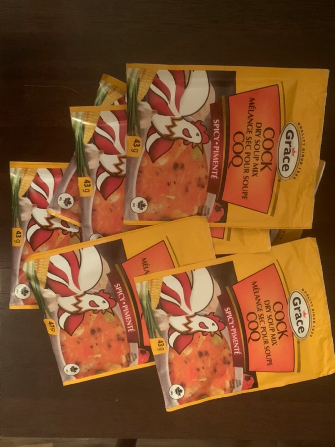 Seven packets of Grace Cock-a-Doodle-Doo Spicy Dry Soup Mix. Each packet weighs 43g. Great for quick and flavourful meals.