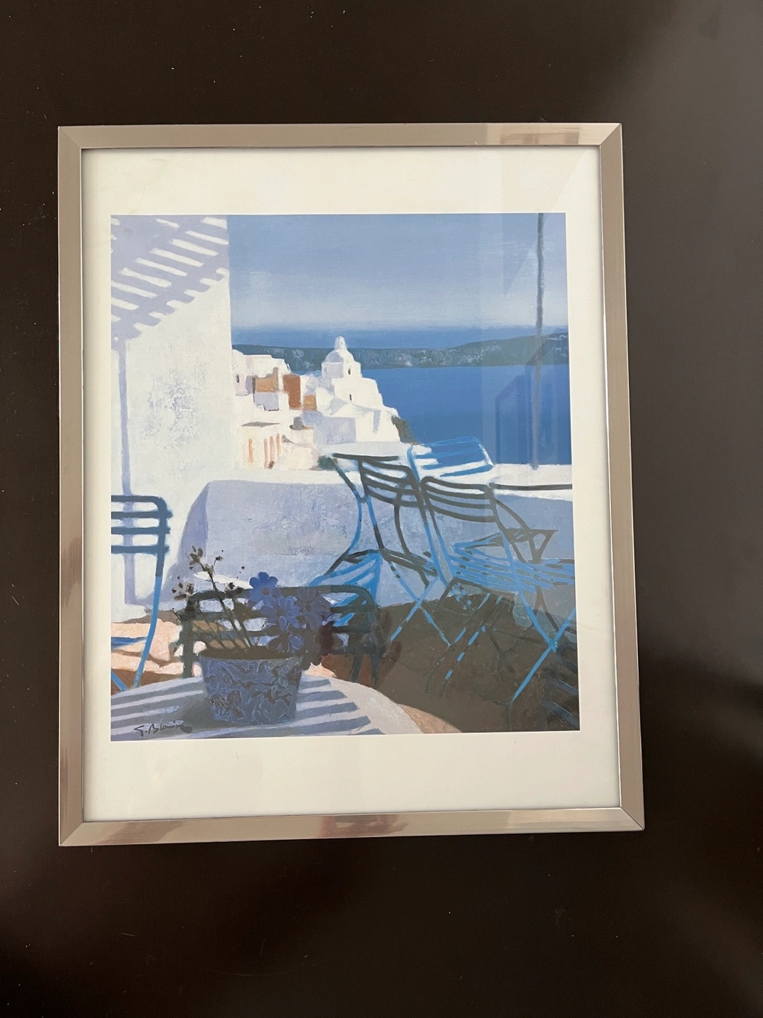 1000+Beautiful framed print.Depicts a Santorini seascape.Silver frame.Ready to hang. Dimensions 52x42 cm.