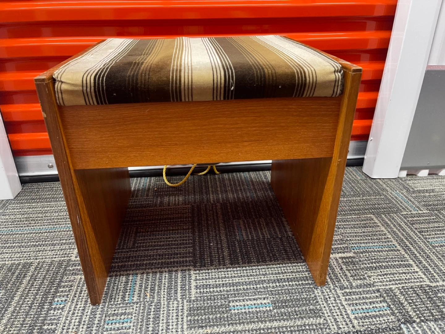 Small wooden stool. Features a striped upholstered seat. Mid-century modern style. Simple design, ideal for extra seating or a small side table.