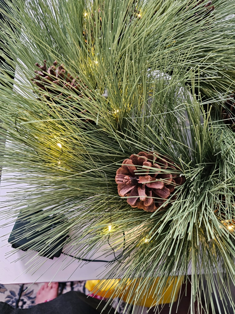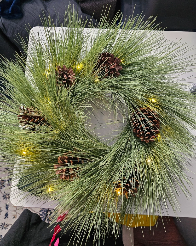 Beautiful artificial wreath. Features pine needles and pine cones. Includes integrated LED lights. Festive holiday decor.
