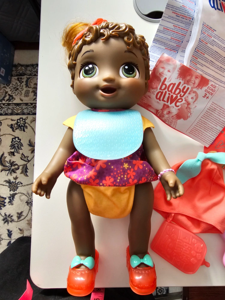 Baby Alive doll, brown skin tone. Includes outfit, shoes, bib, extra clothes, and accessories. Great condition, instructions included.