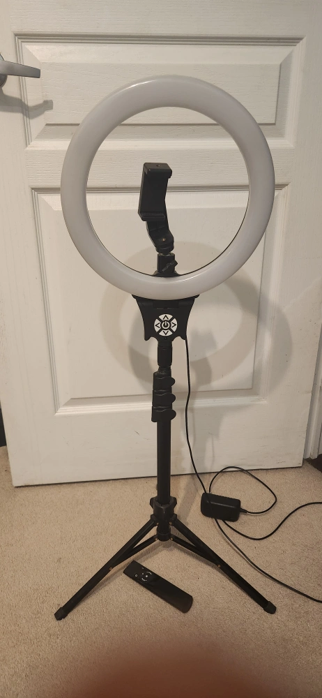 10-inch ring light. Adjustable brightness. Includes tripod stand and remote control. Phone holder attaches to the light. Can also be adjusted to 6 feet