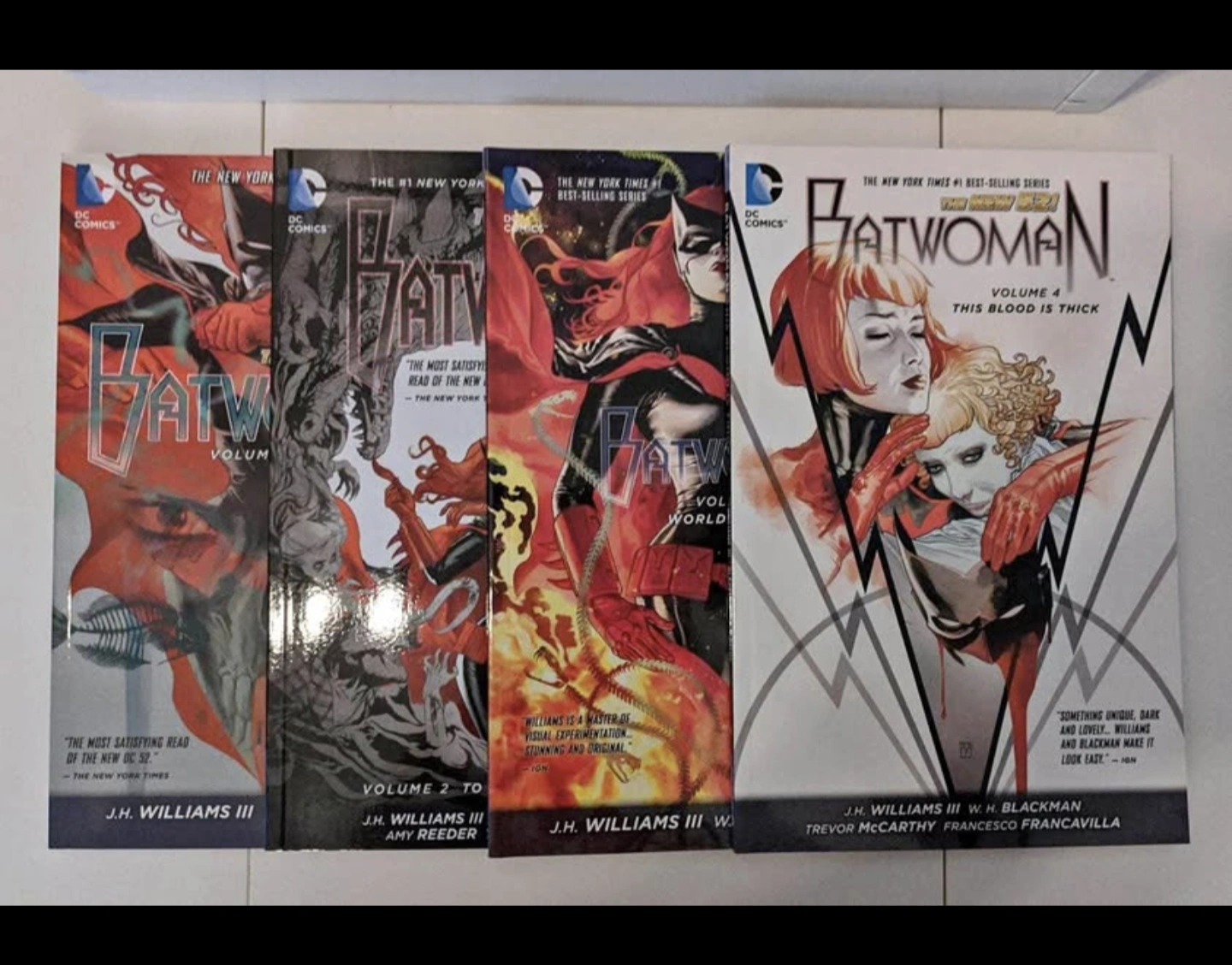 751Batwoman TPB 1-4 comic DC Comics Comic Book Graphic Novels Set "A NEW YORK TIMES BESTSELLER As a part of the acclaimed DC Comics--The New 52 event of September 2011, Batwoman's new series finally begins! The creative team of J.H. Williams III and W. Haden Blackman launch the ongoing Batwoman series, as Batwoman (a.ka. Kate Kane) faces deadly new challenges in her war against Gotham City's underworld-and new trials in her personal life. Who or what is stealing children from the barrio, and for what vile purpose? Will Kate train her cousin, Bette Kane (a.k.a. Flamebird), as her new sidekick? How will she handle unsettling revelations about her father, Colonel Jacob Kane? And why is a certain government agency suddenly taking an interest in her? These are some of the questions that will be answered in this long-awaited series!"