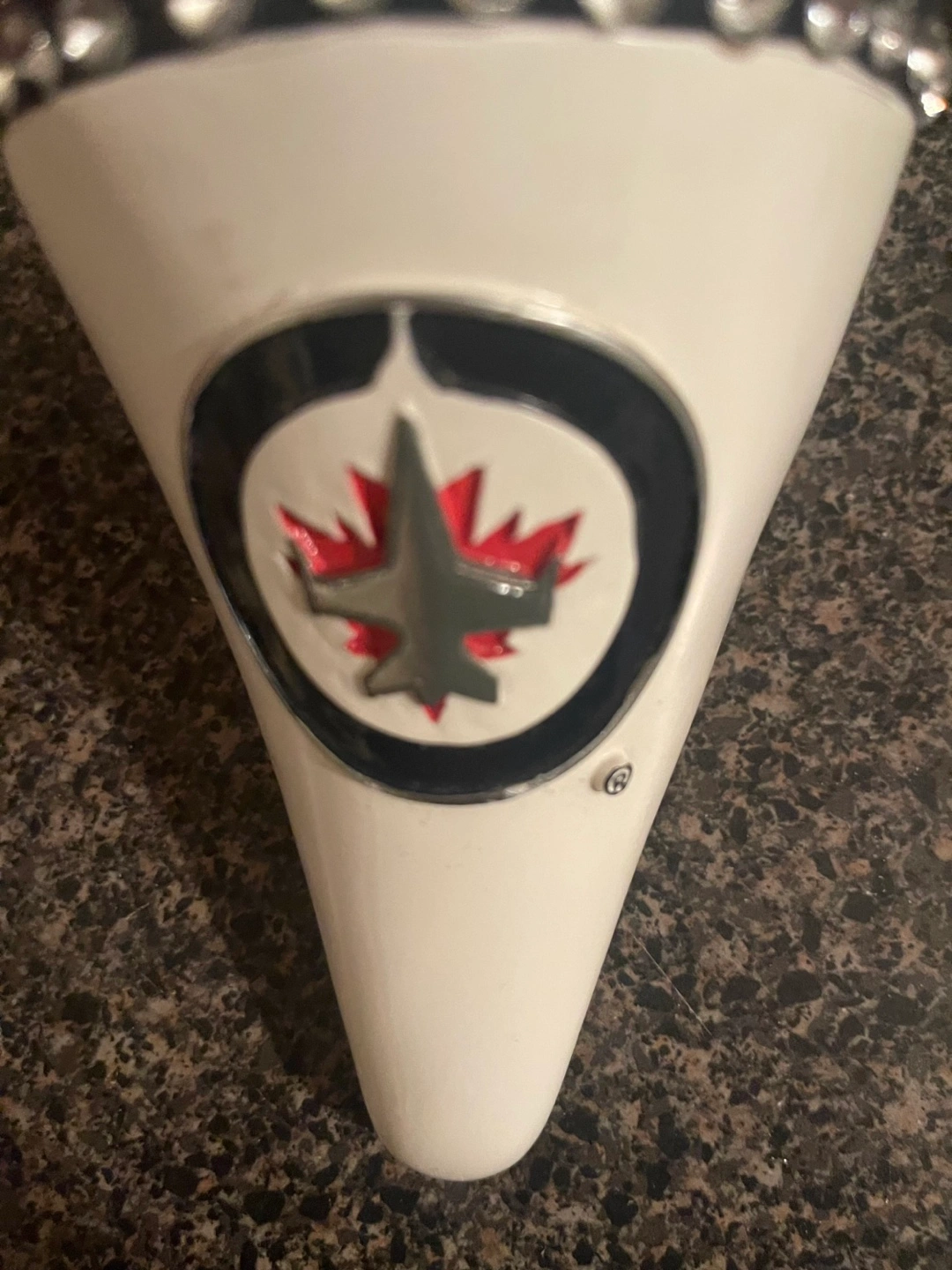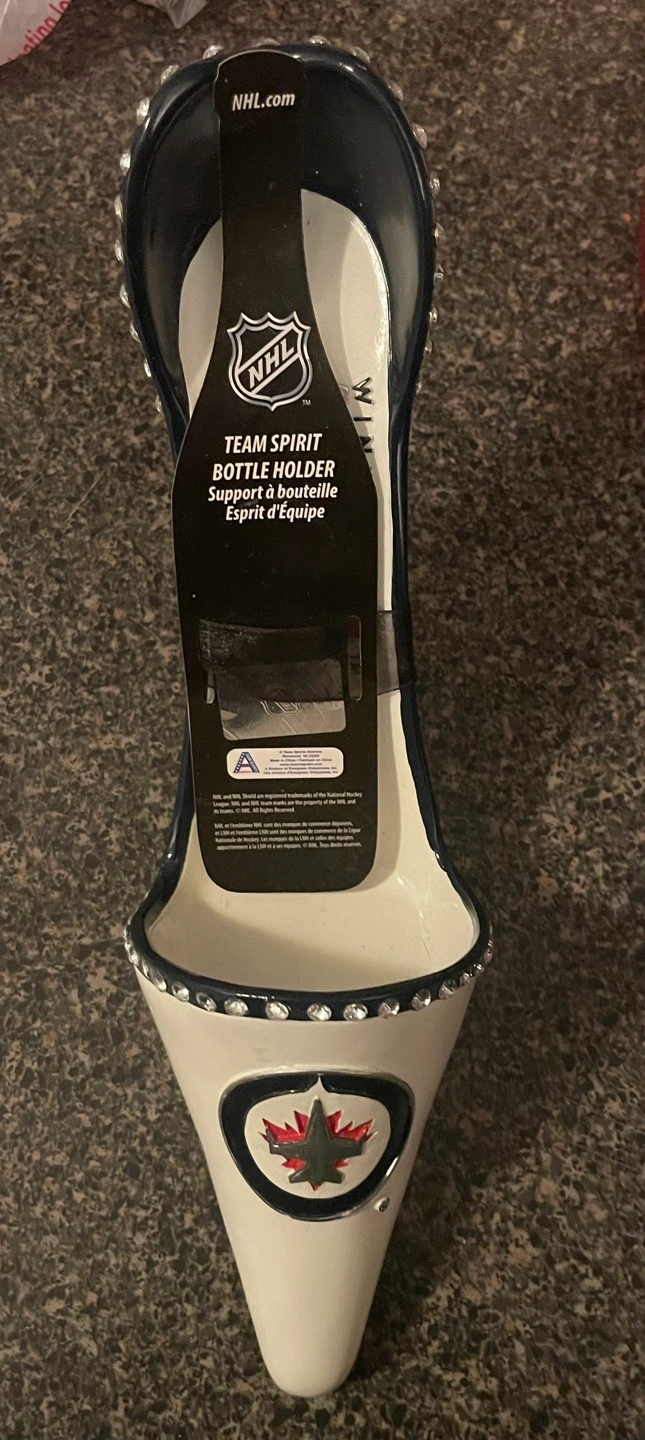 Unique bottle holder. Shaped like a high-heeled shoe. Features Winnipeg Jets logo and NHL branding. Includes black ribbon accents. Made by Team Sports America.