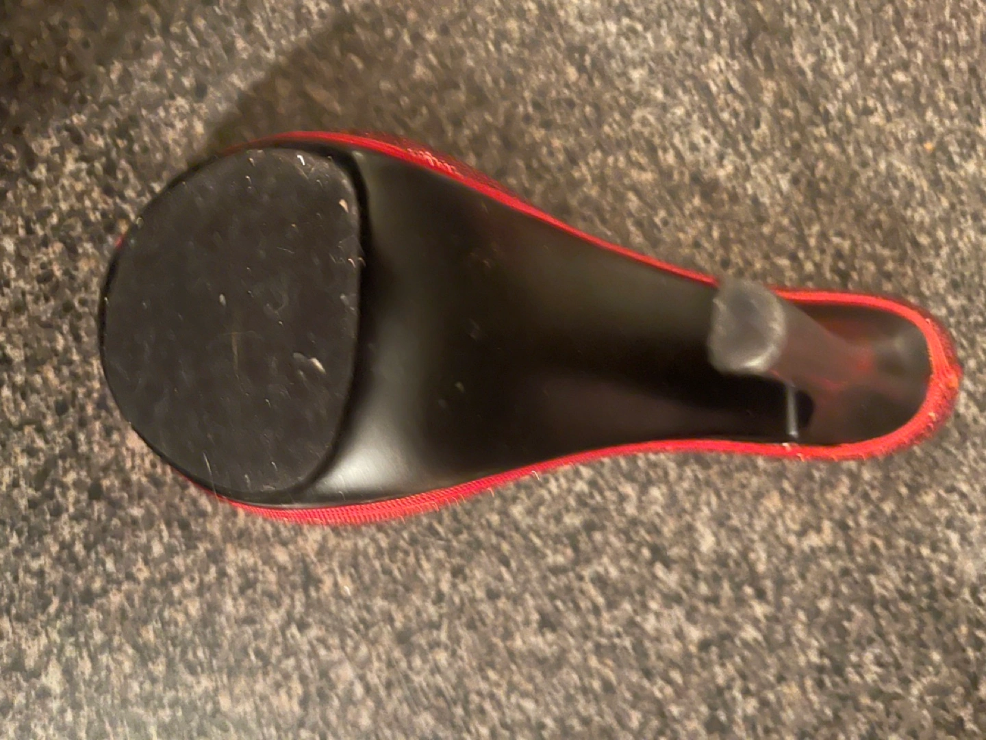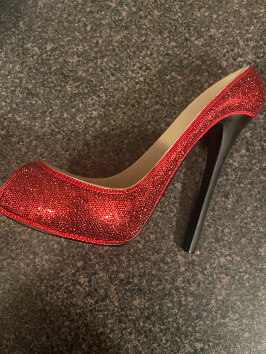 Red sparkly high heel shoe. Open toe design. Great decor and display for guests holds Your favorite wine bottle dis play with elegant and class.