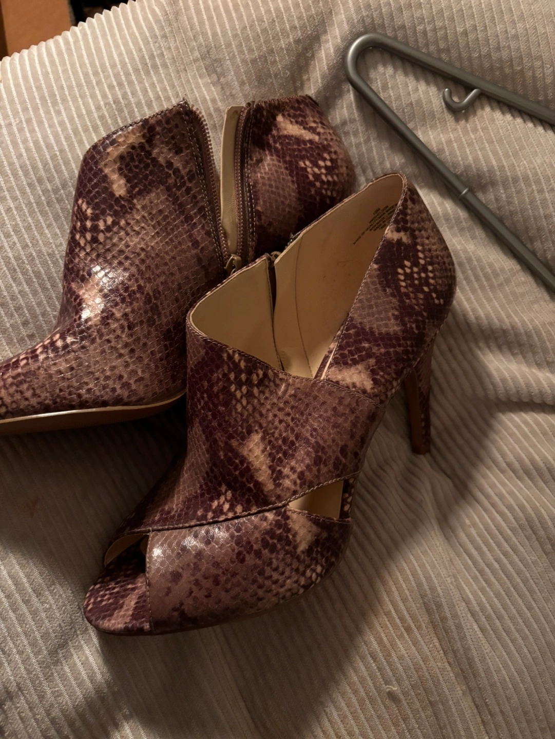 women's shoes. Includes a pair of Nine West snakeskin print peep-toe booties, a pair of black More & More ankle booties with studded detail, and a pair of brown leather mules. Coach white wedge style
