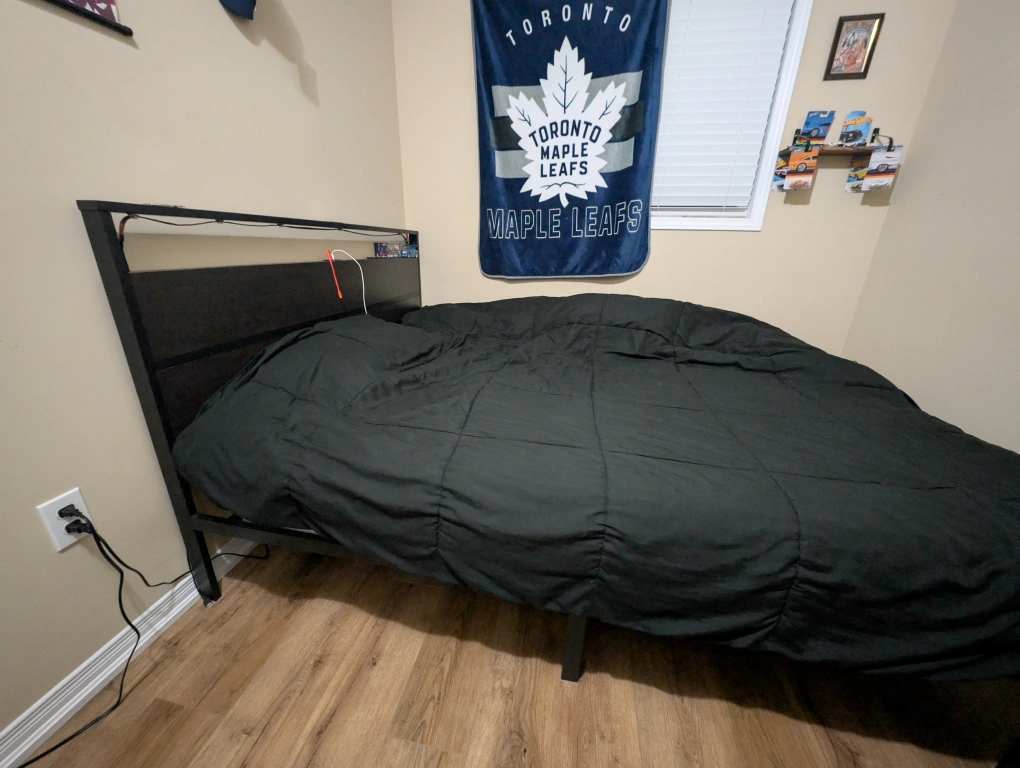 Rolantar queen bed frame. USB charging ports. Metal slats. No box spring needed. Under bed storage. Good condition.