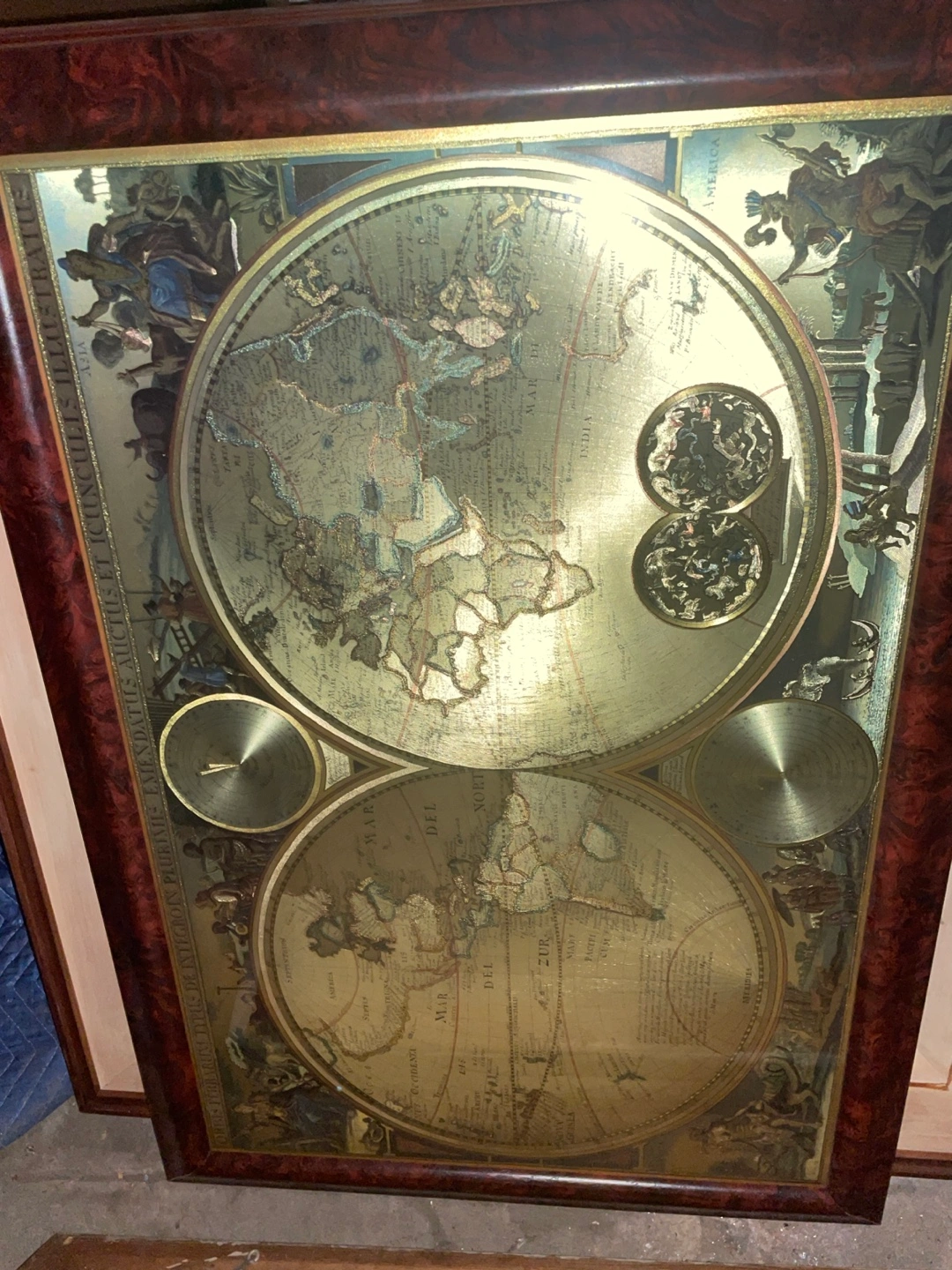 Large framed world map. Features gold leaf detailing and an ornate wooden frame. Antique style. Two hemispheres shown.