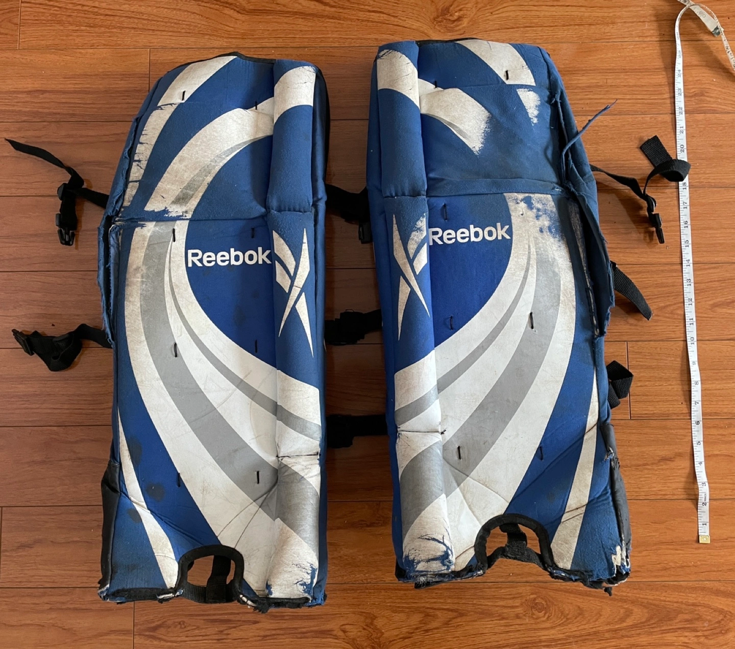 Pair of used Reebok goalie leg pads. Size 27 inches. Show some wear and tear. Black and blue colour scheme. Good for practice or casual play. At $10 each.