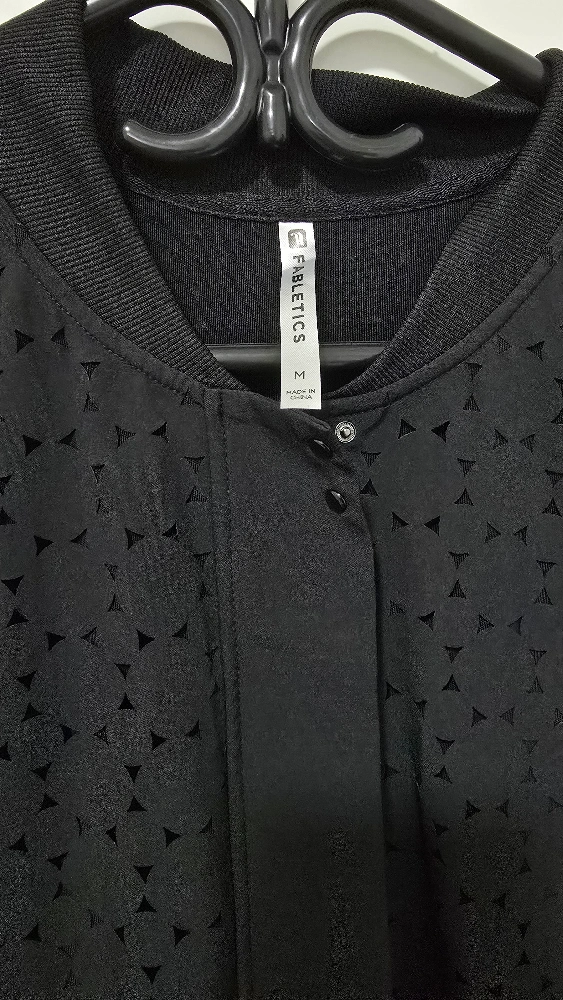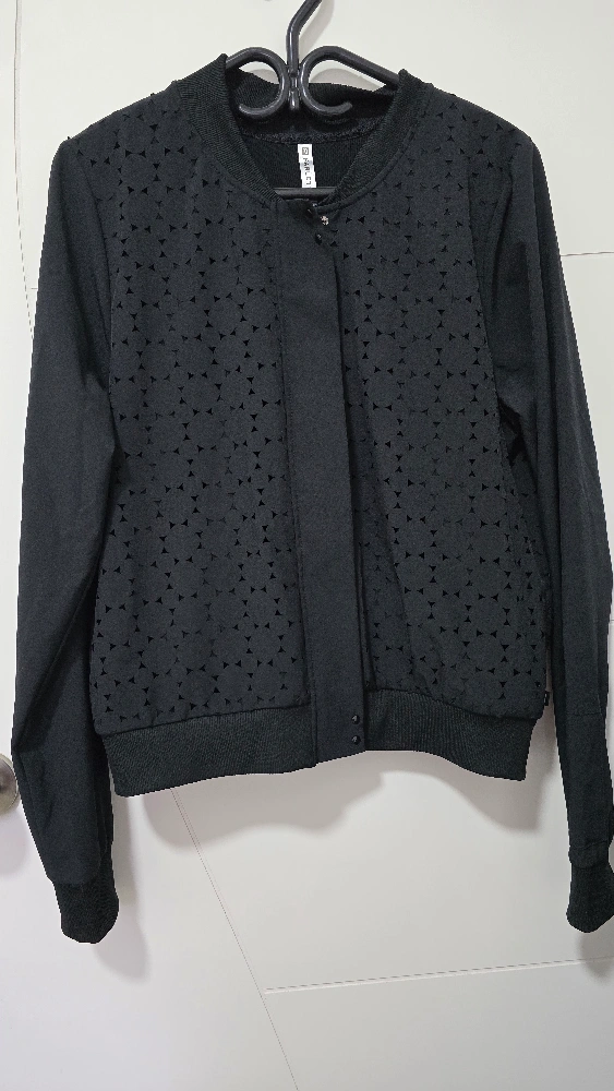 Black Fabletics bomber jacket. Size medium. Laser cut detailing throughout. Long sleeves. Snap button closure.