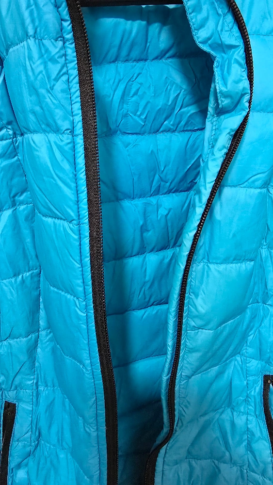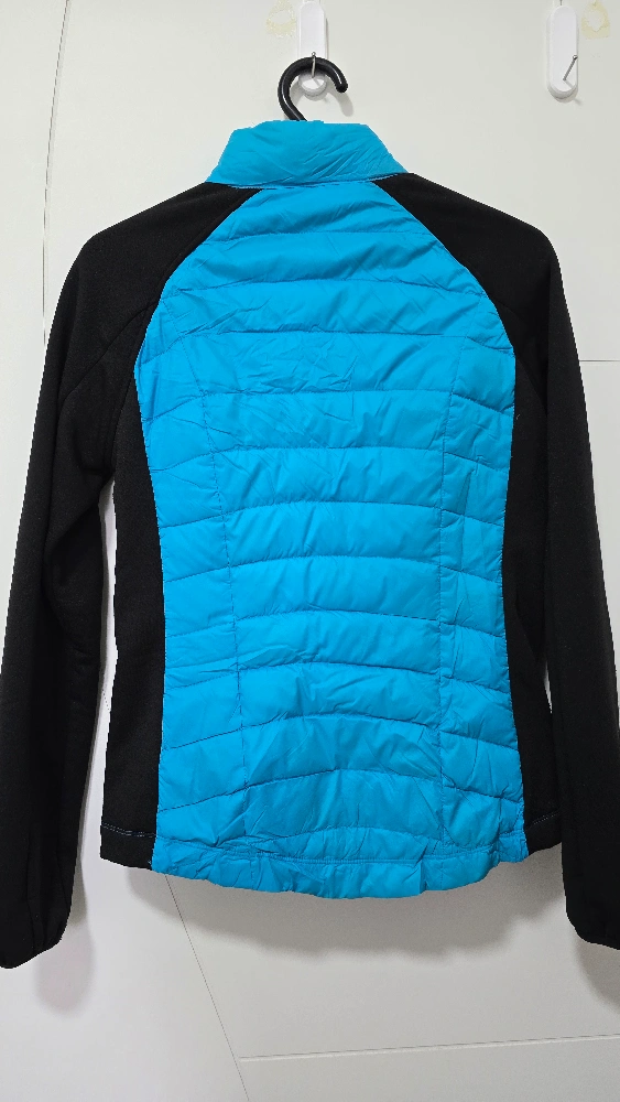 Lightweight puffer jacket. Teal and black colour block design. Full zip closure. Two zippered pockets. Long sleeves. Great for layering.