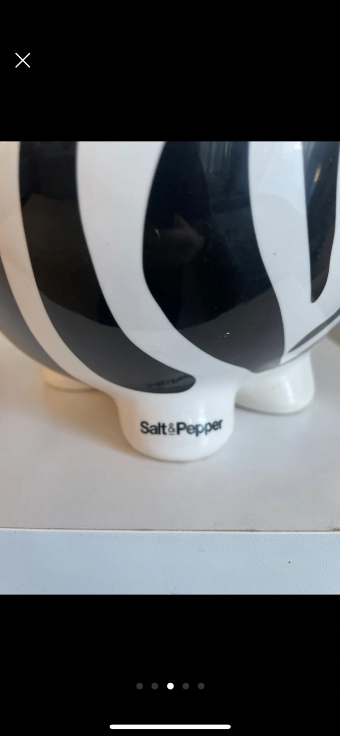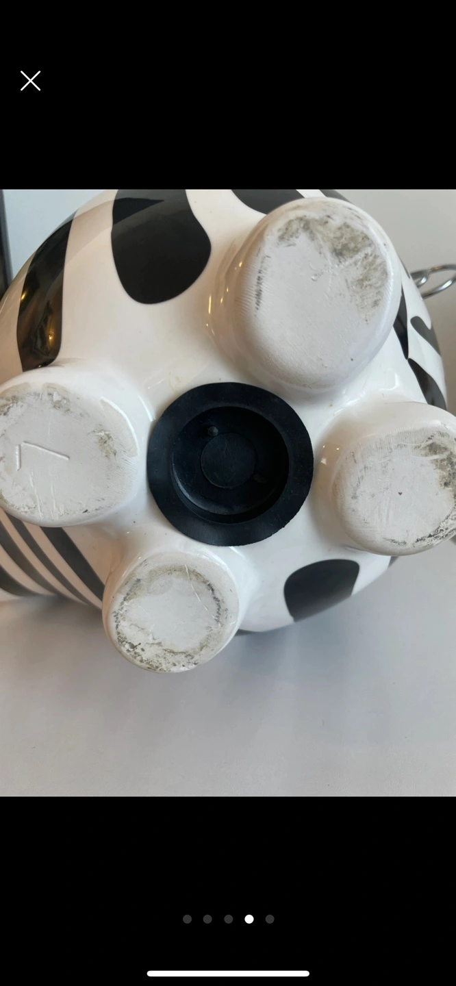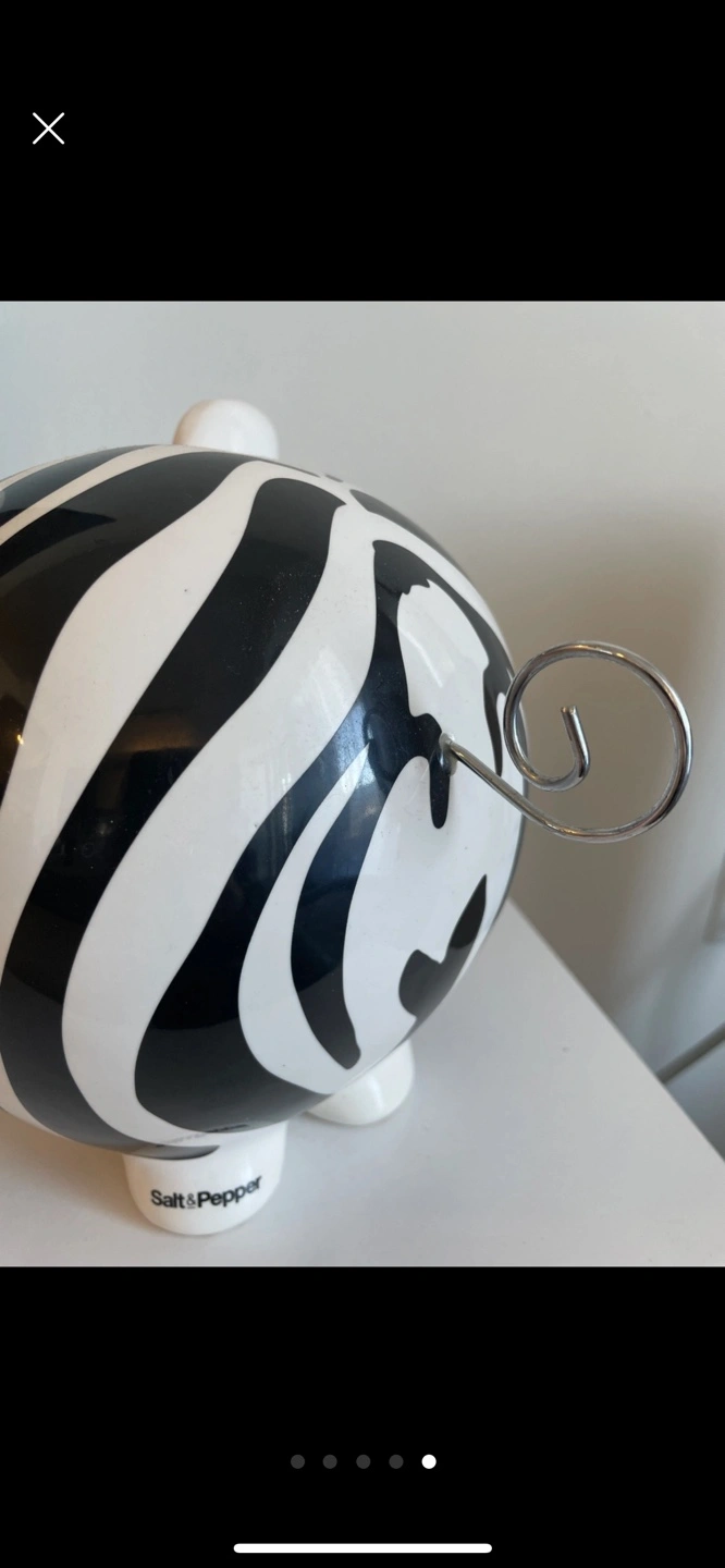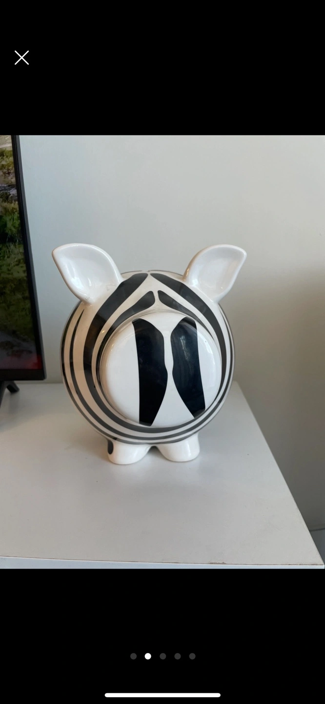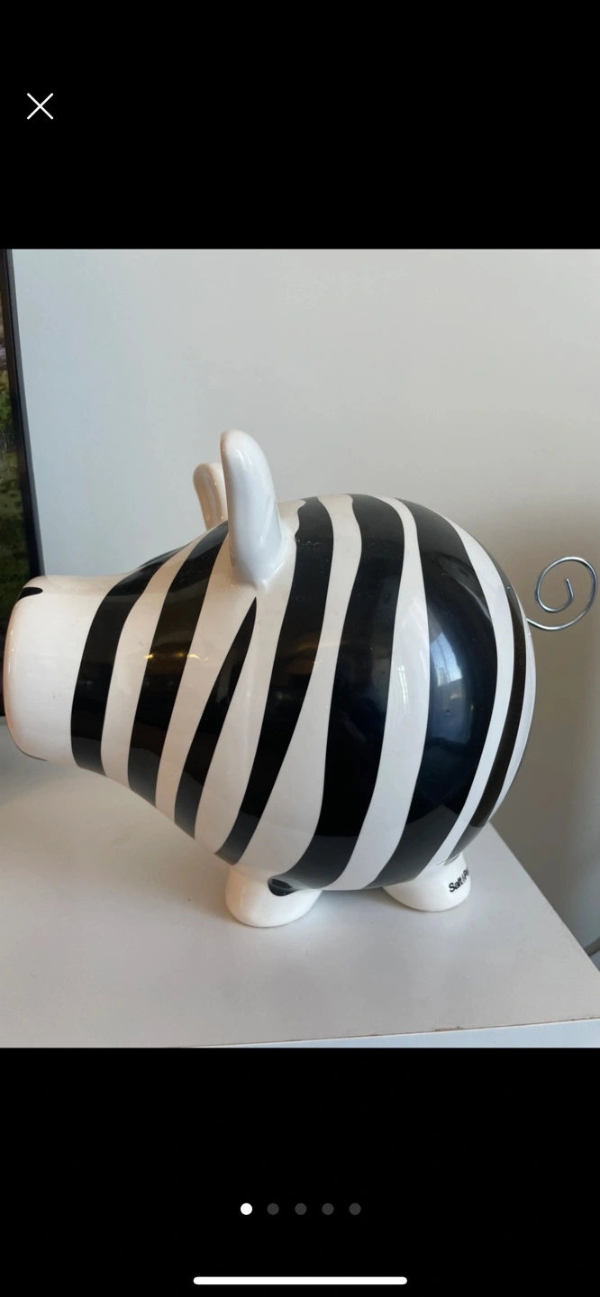 300Ceramic piggy bank. Black and white zebra print. Features a metal tail.