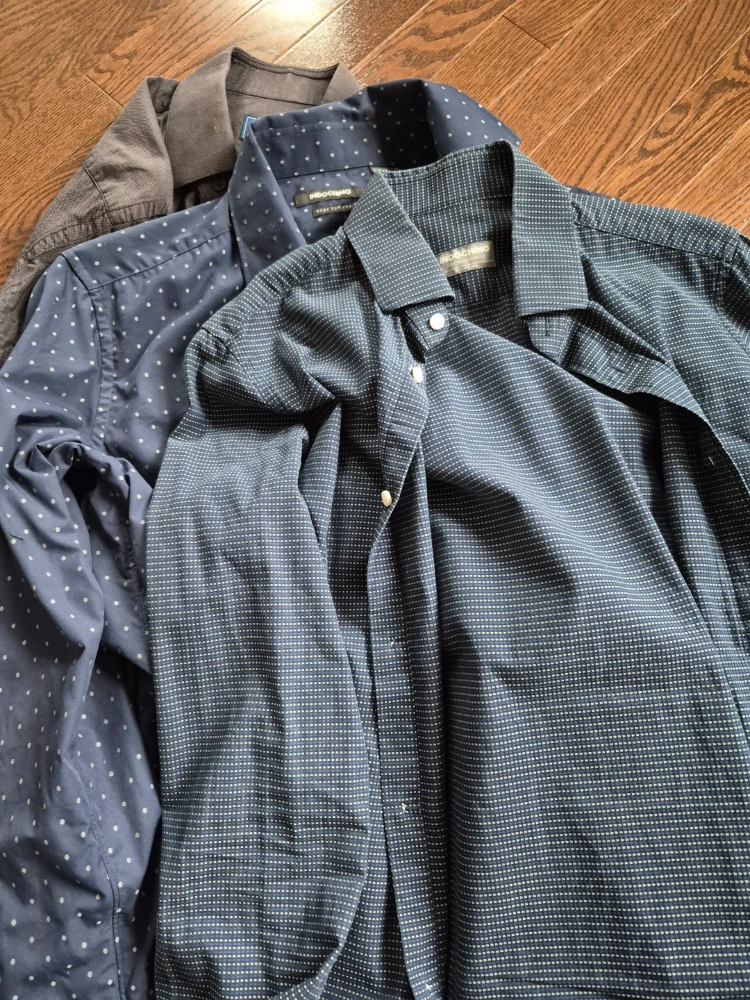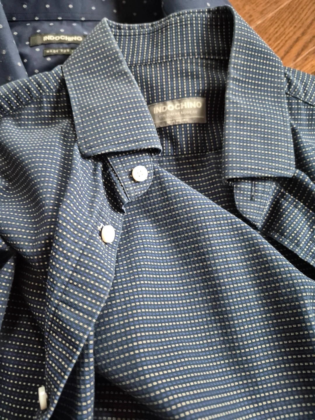 Two men's dress shirts from Indochino. One navy with white polka dots, and another blue with a fine white dot/line pattern. Both are collared with button-front closures. They're suitable for business or casual wear. 3 for 10