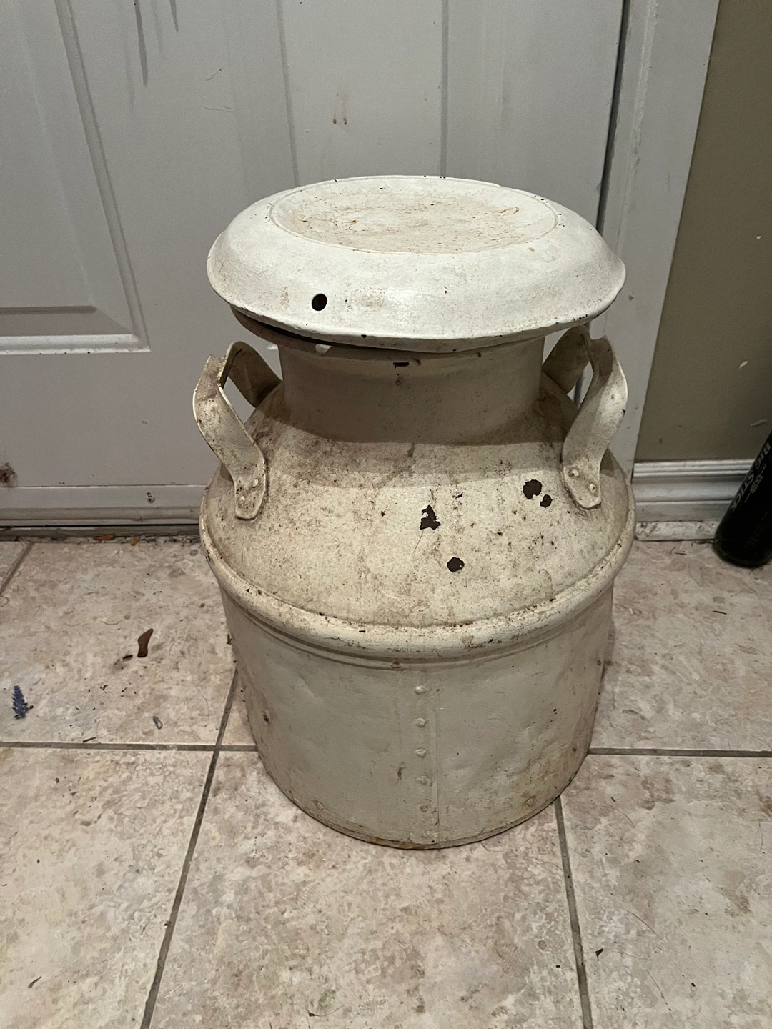 Antique milk can. White painted metal. Shows wear consistent with age. Two handles. Lid included. Great for rustic decor or farmhouse style.