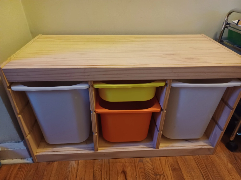 35TROFAST storage unit. Three compartments. Includes 4 plastic storage bins. Great for storing kids toys. All measurements of unit and bins in photos. Dependant on area, may be able to deliver with etransfer deposit.
