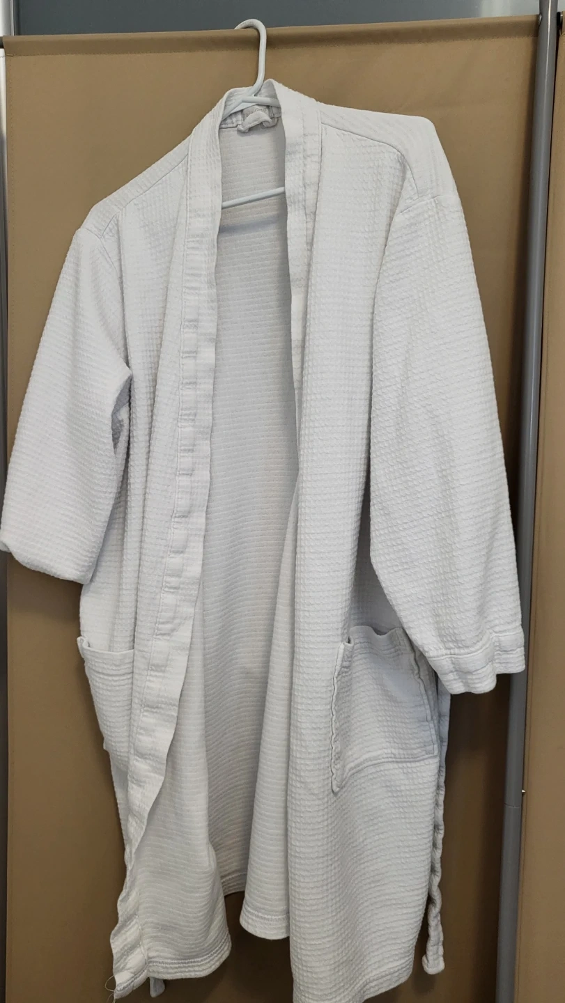 Selling a white waffle-textured robe. It has a comfortable and absorbent material, perfect for after showers or lounging around the house. It features two front pockets and a tie waist
