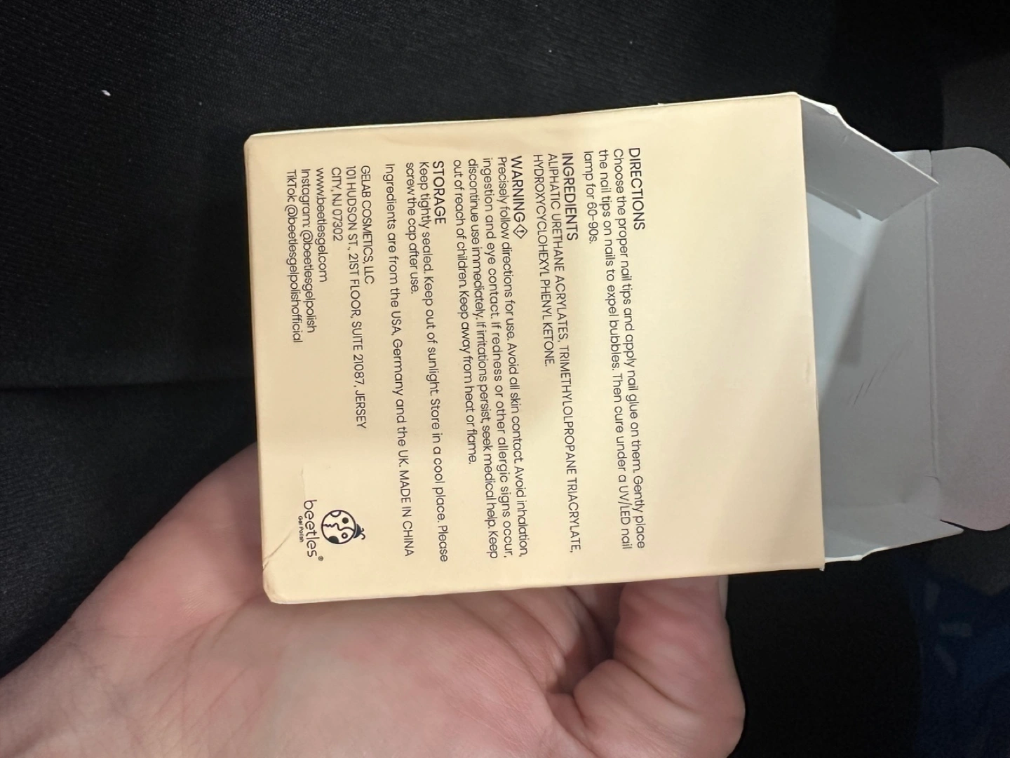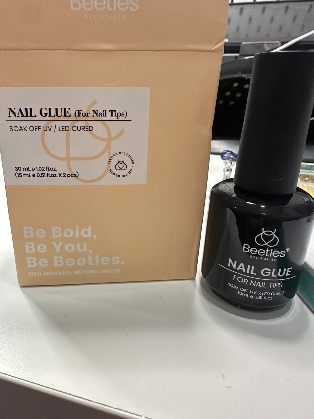 New, unopened box of Beetles nail glue. Soak off UV/LED cured. Two 16 mL bottles included. Perfect for applying nail tips.