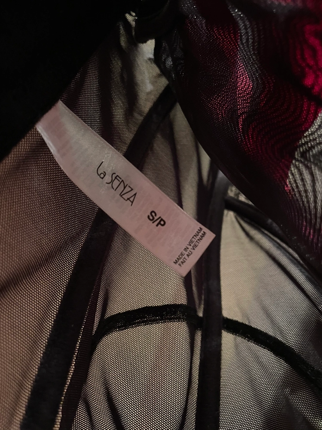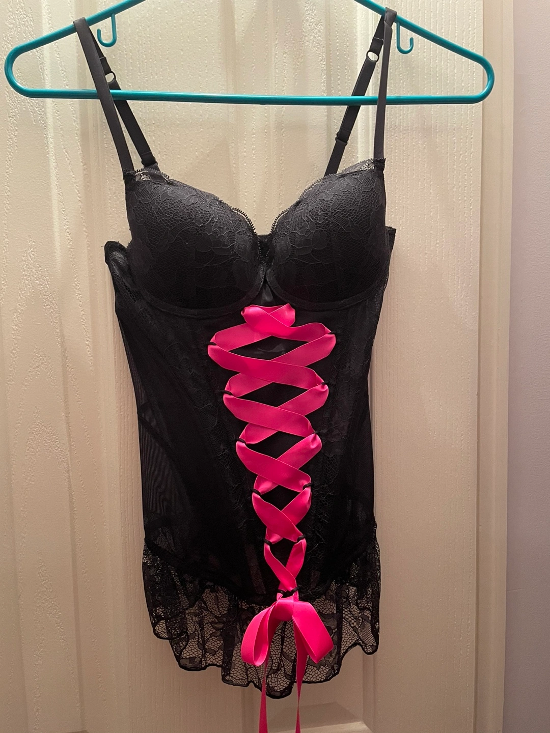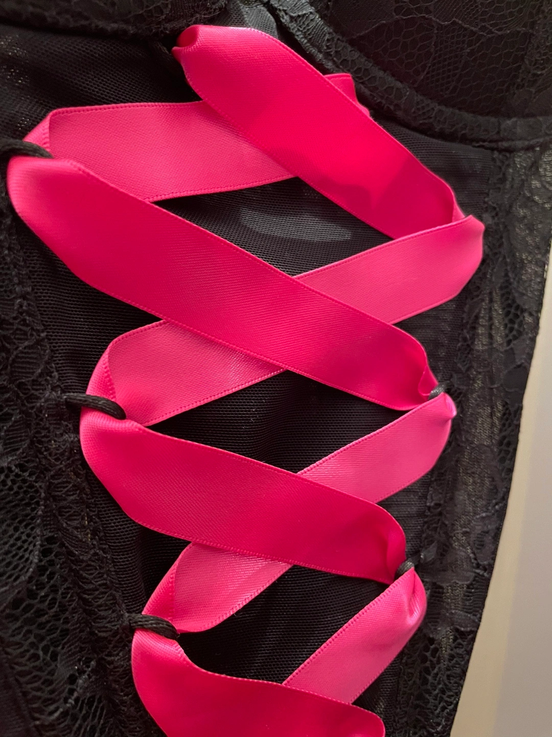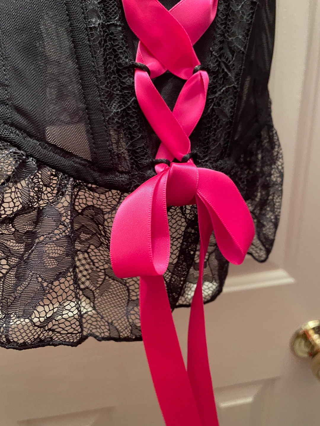 La Senza black lace corset with pink ribbon detailing. Features a hook-and-eye closure and adjustable straps. Size small.