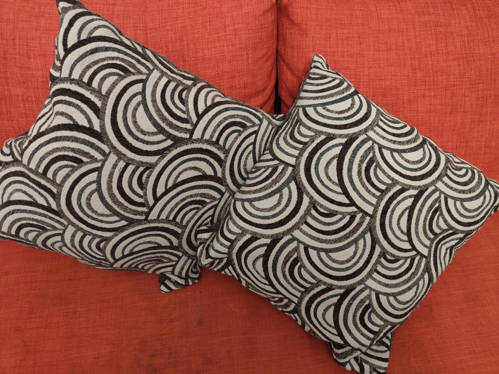 Two cushions, matching design. Cream and brown curved lines pattern. Soft fabric. porch pickup only st clarens and Wallace