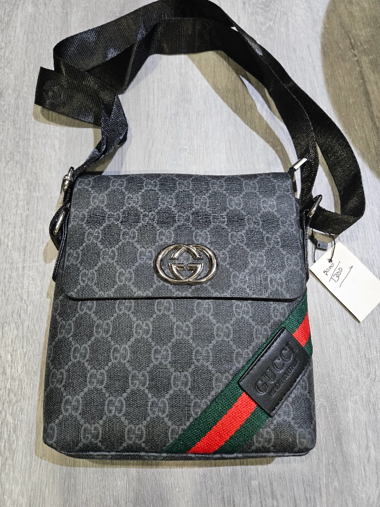 Black and grey GG Supreme canvas messenger bag. Features a red and green web stripe detail and adjustable shoulder strap. Silver-toned hardware.