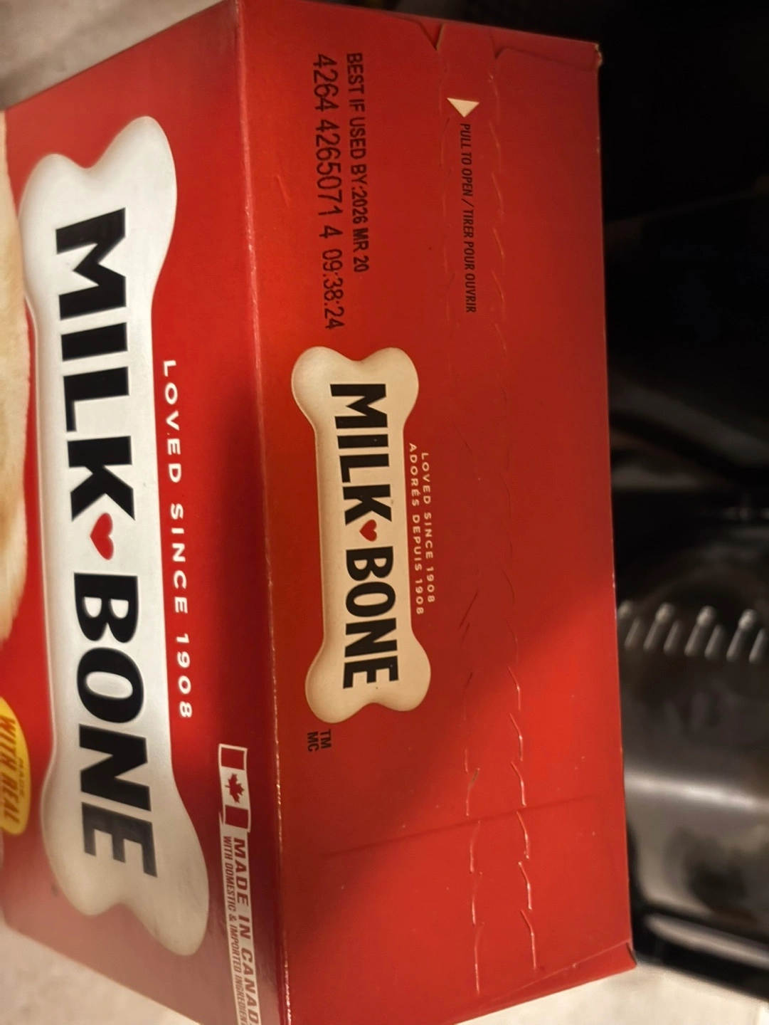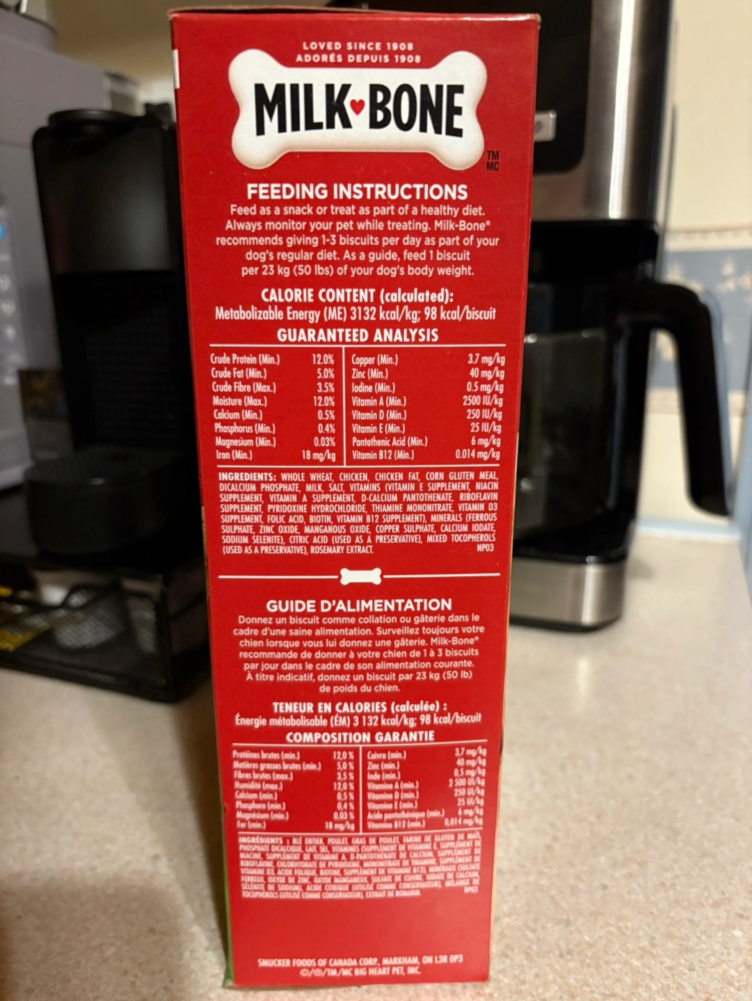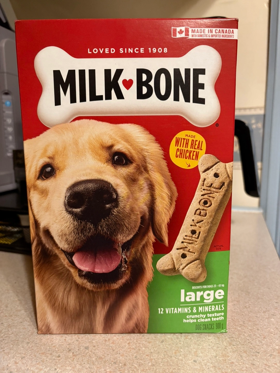 Box of Milk-Bone large dog biscuits. Made with real chicken. 12 vitamins & minerals. Crunchy texture helps clean teeth. For dogs 22-45 lbs.