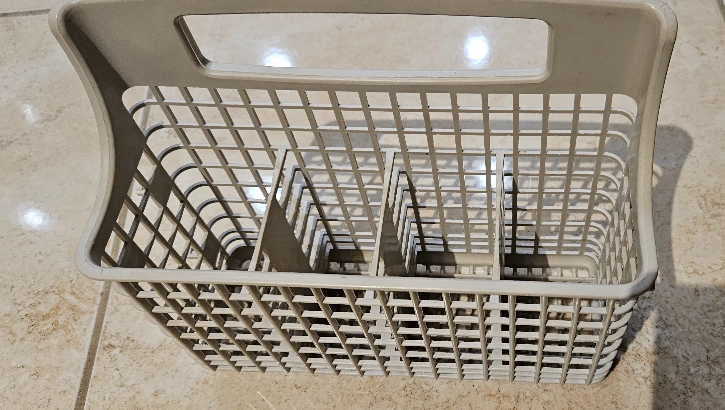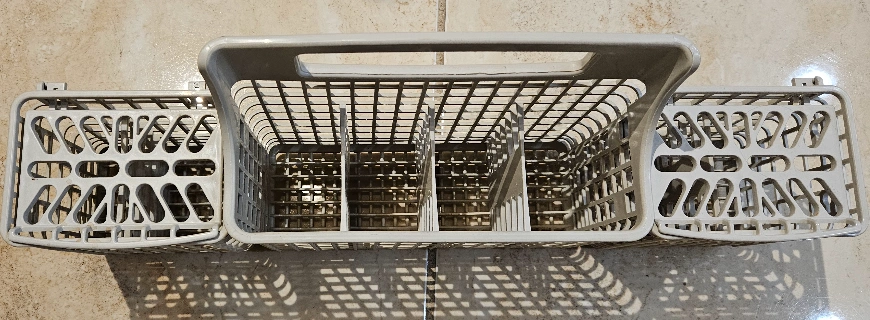 Dishwasher basket set. Light beige plastic. Includes cutlery basket and two side baskets can be devidet for 3 parts. (side pieces 5"long-3") (middle part 9.5"-3") Good used condition. like new.