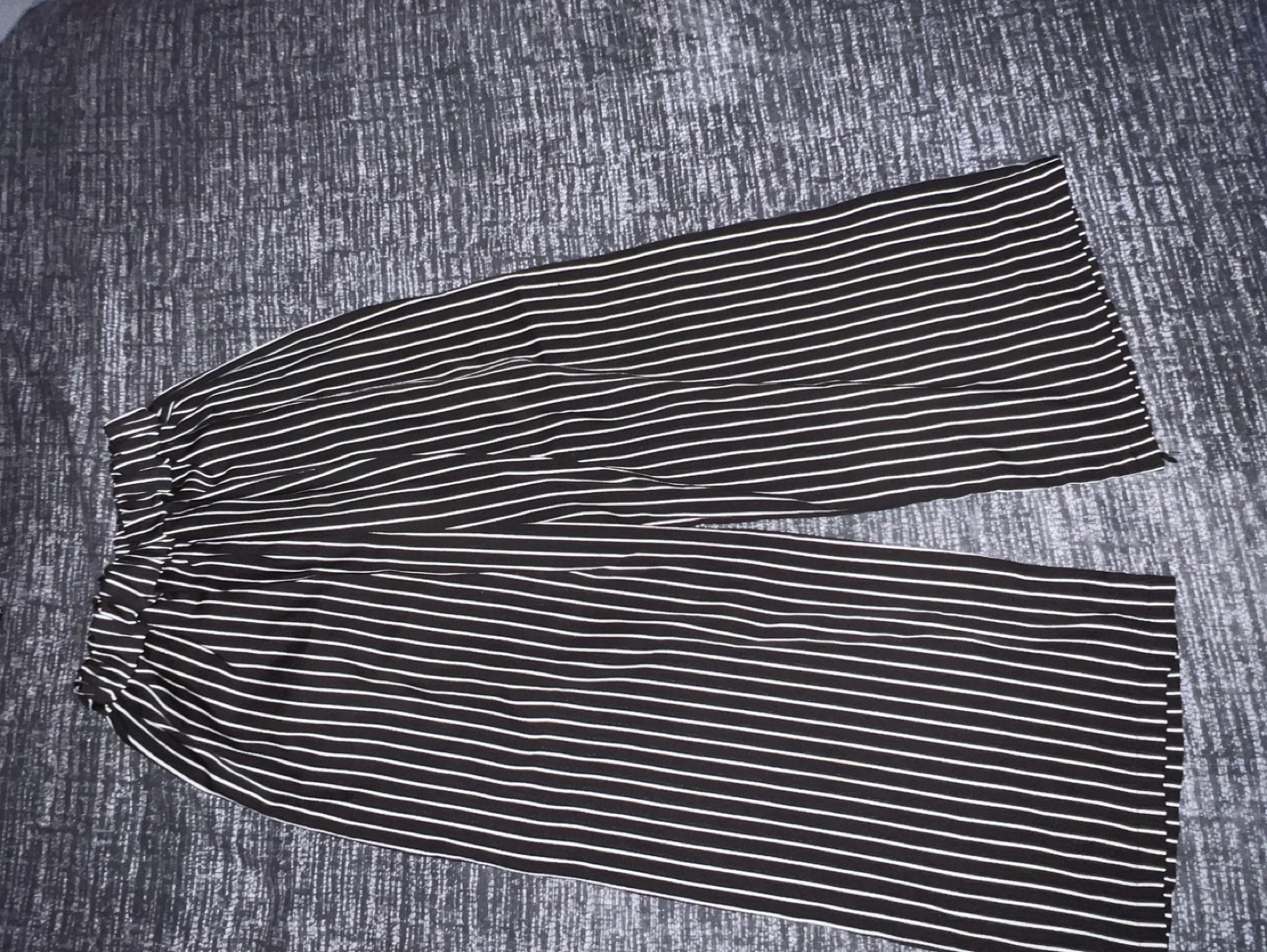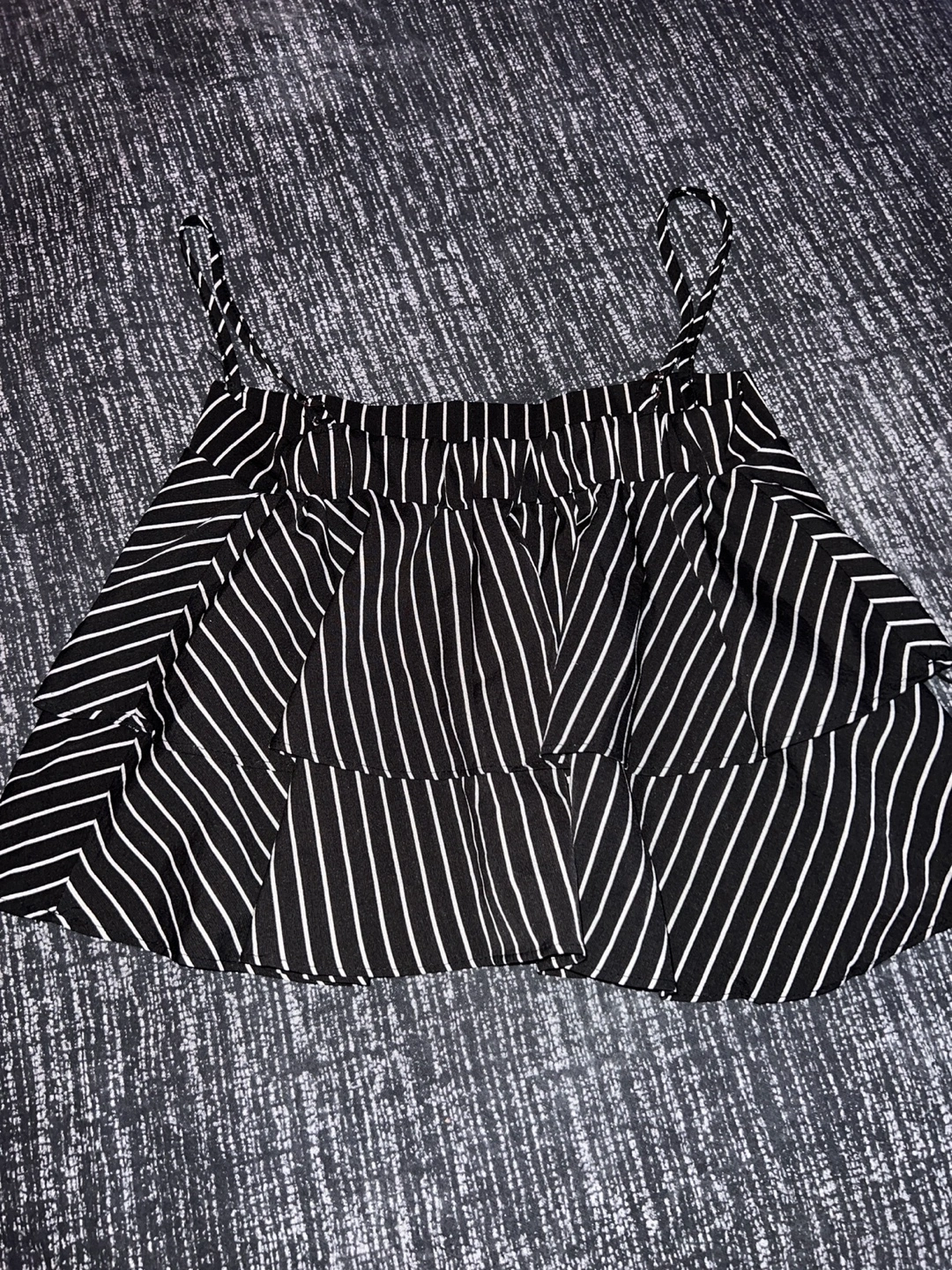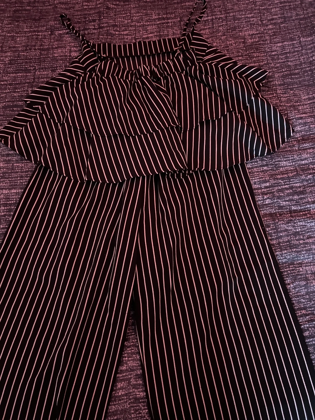 Stylish black and white striped jumpsuit. Features a ruffled top and wide-leg bottoms. Perfect for a summer outing.