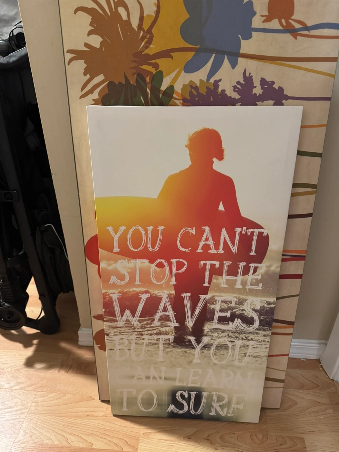 Two canvas prints for sale. One features an abstract floral design in warm colours. The other depicts a surfer at sunset with a motivational quote. Both are in good condition, ready to hang. Perfect for adding a touch of style to any room.