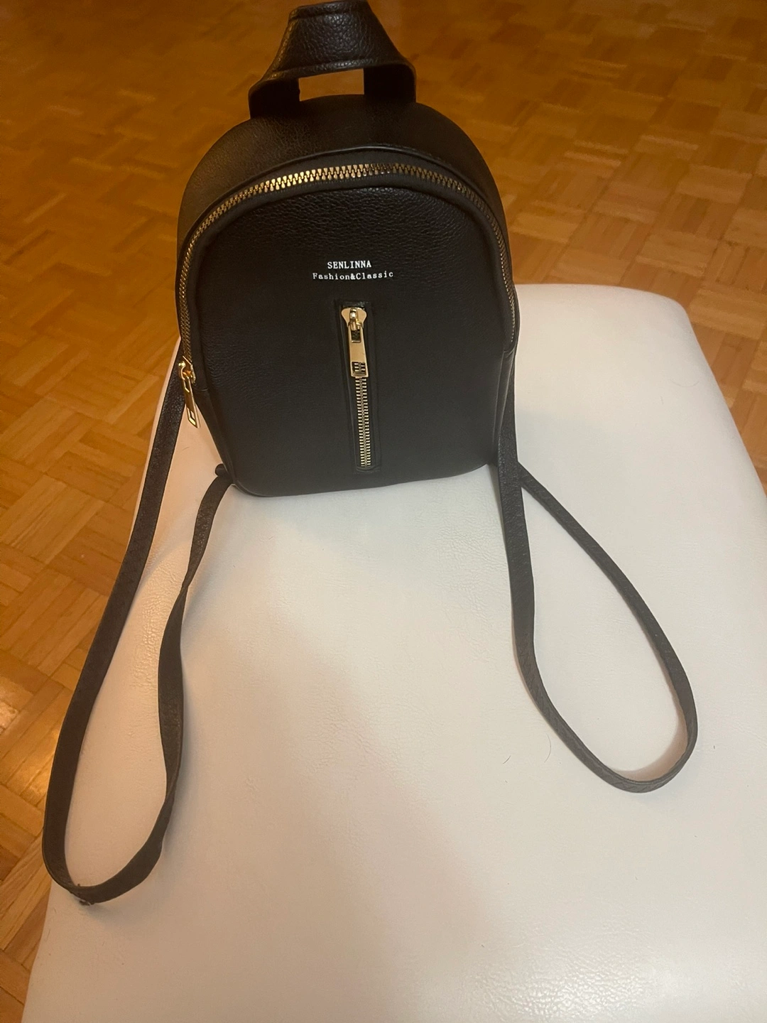 409Black mini backpack. Small size, ideal for everyday use. Features adjustable straps and gold-toned hardware. Zipper closure.