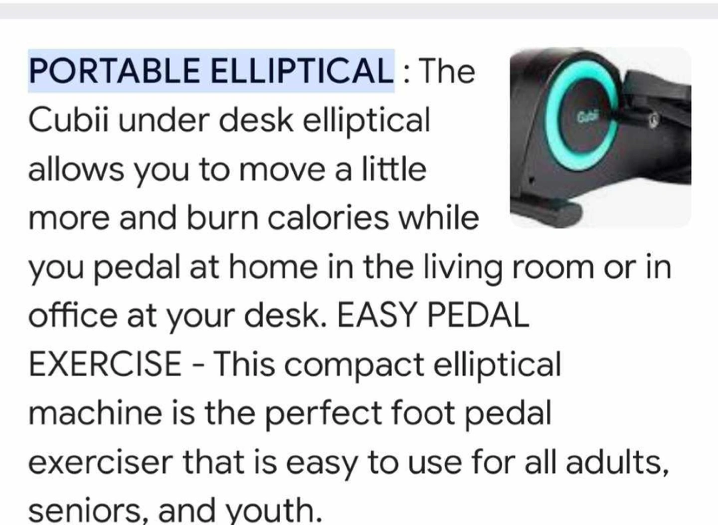 Cubii Portable elliptical machine. Great for home use. Includes a mat. Great condition. Bought 2+ years ago. Currently retails for $269.