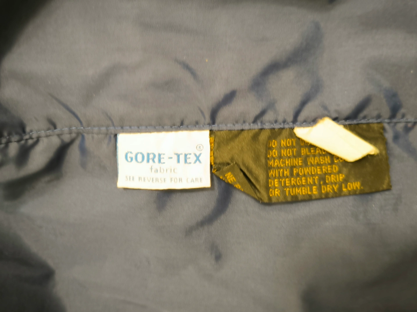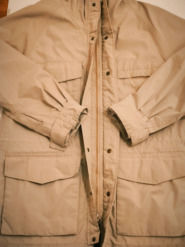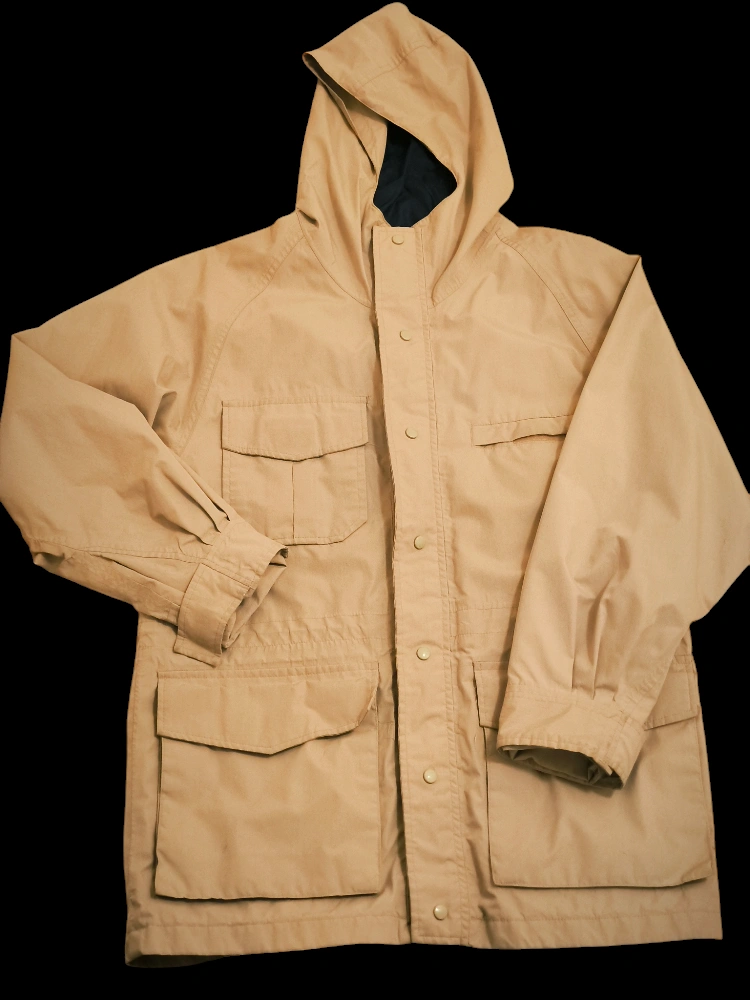 Like New Vintage Eddie Bauer Men's tan outdoor light hooded jacket. Multiple pockets. Zipper and snap closure. GORE-TEX lamination. pit to put : 21". Length 32".