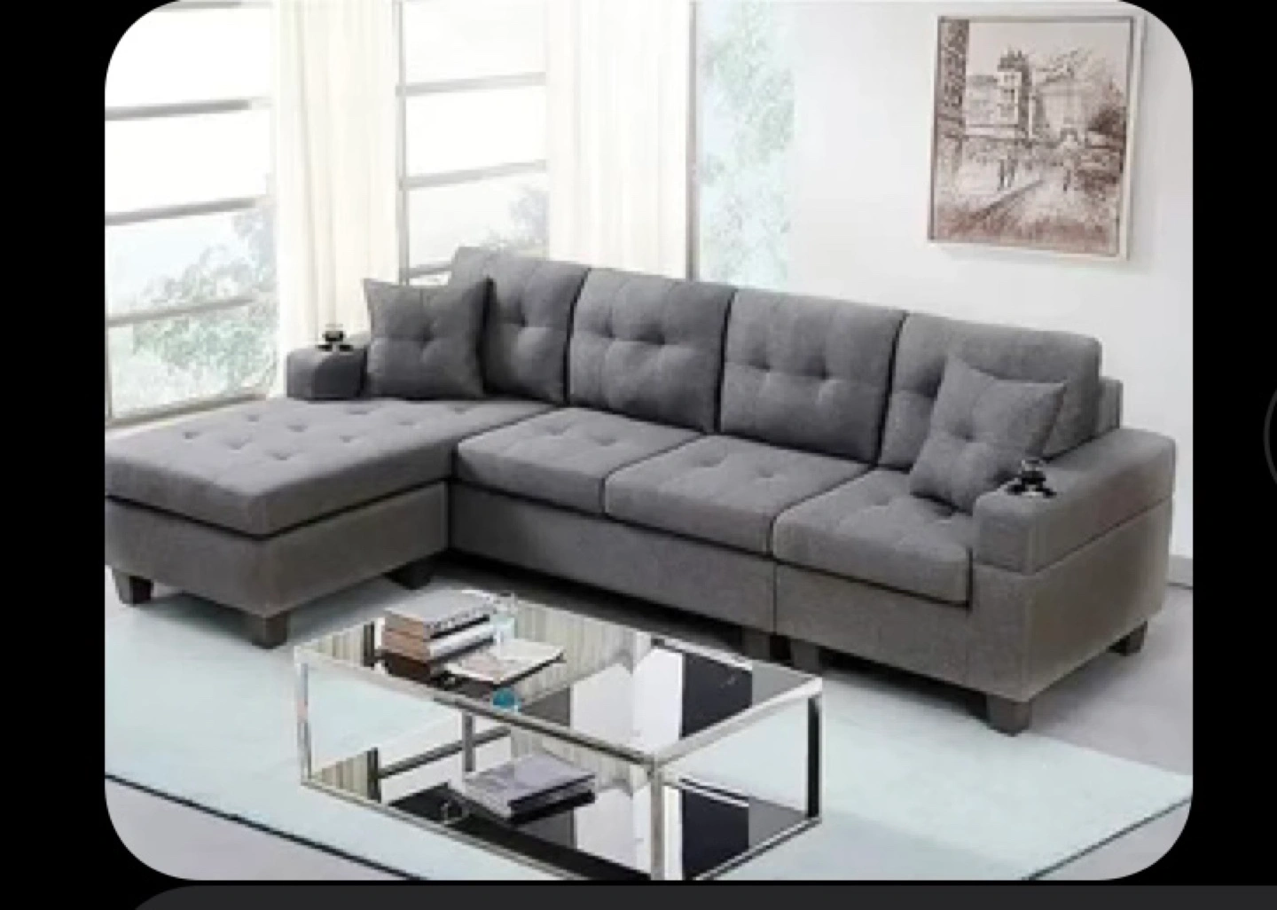 Four seat grey fabric sofa. Includes lounge and multiple cushions. Modern design, simple instructions, perfect for small living room/apartment, office or bedroom.