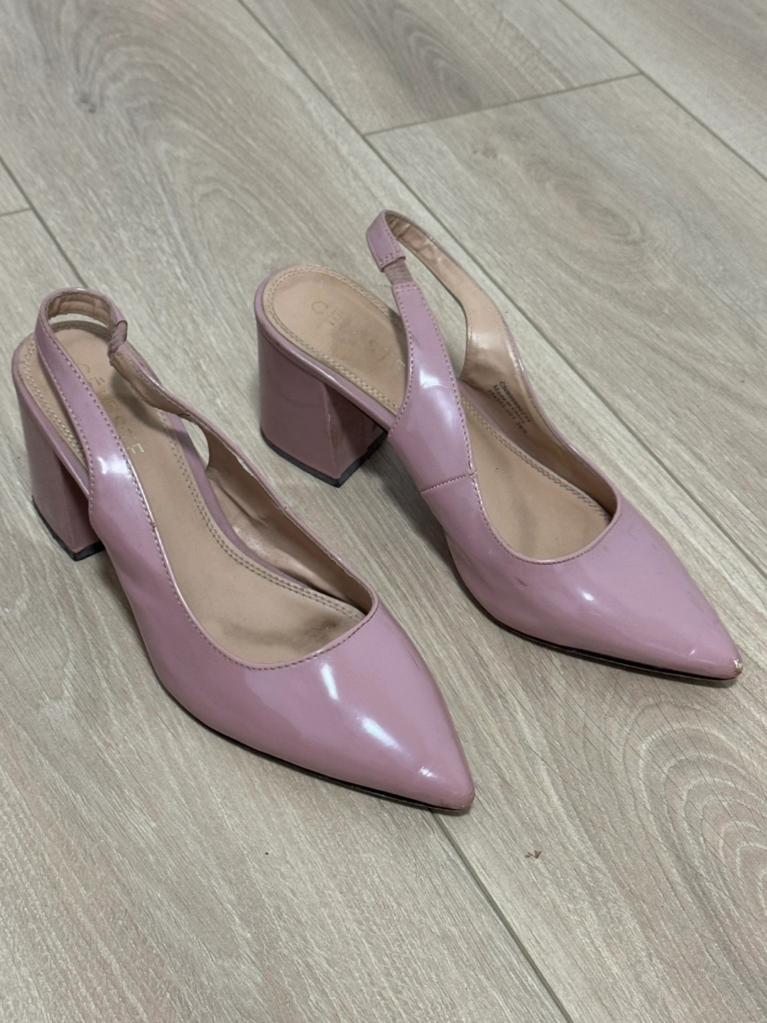 39Pair of dusty rose patent leather slingback heels. Pointed toe and a chunky block heel. Excellent for a night out or special occasion.
