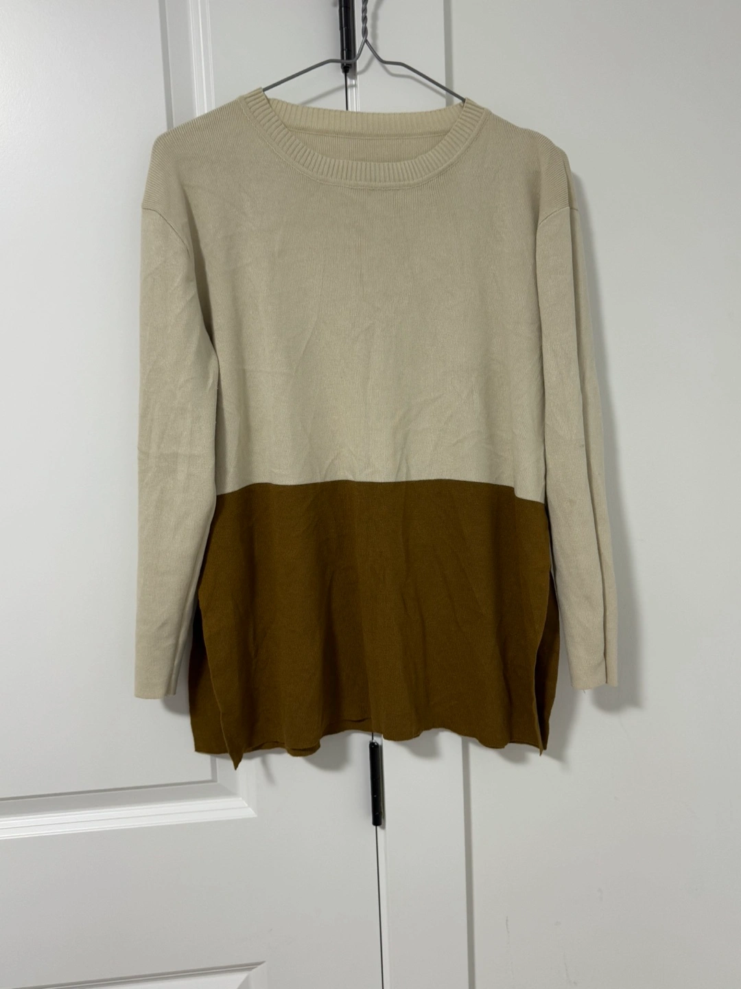 39Pair of wide-leg knit pants, mustard colour. Relaxed fit. Also includes a cream and mustard colour-blocked knit sweater. Three-quarter sleeves. Both items appear to be in good condition.