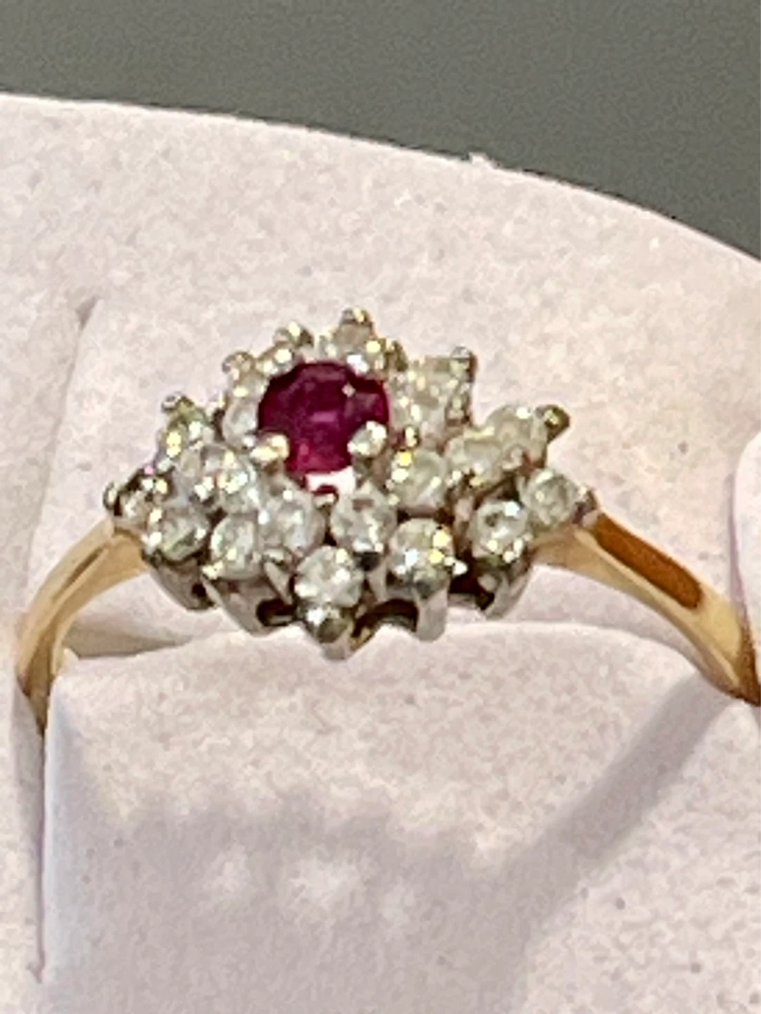 A delicate 10k gold ring featuring a central ruby surrounded by small diamonds. This ring is elegantly designed for a touch of sparkle. It's a beautiful piece for special occasions or everyday wear.