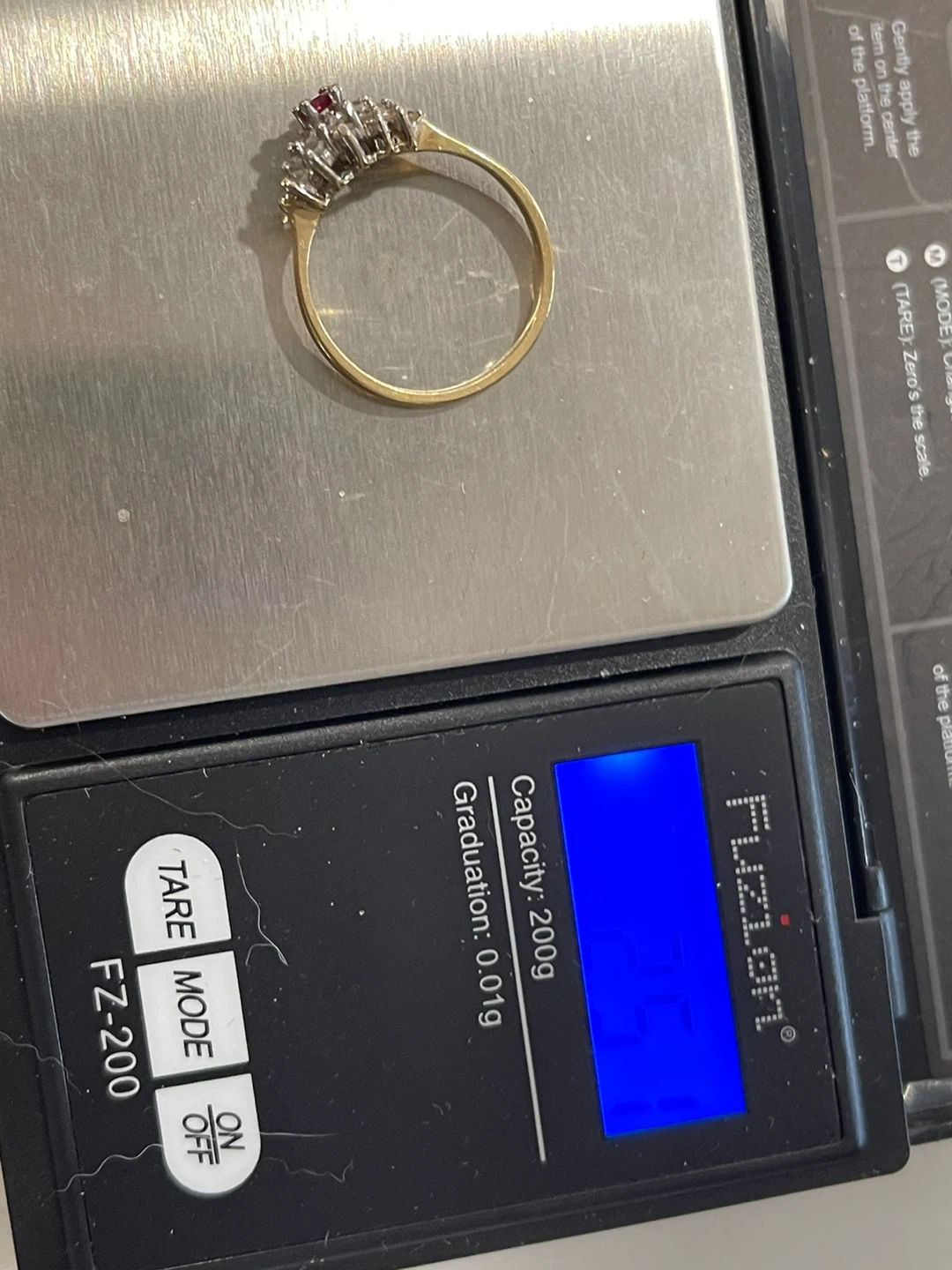 A delicate 10k gold ring featuring a central ruby surrounded by small diamonds. This ring is elegantly designed for a touch of sparkle. It's a beautiful piece for special occasions or everyday wear.