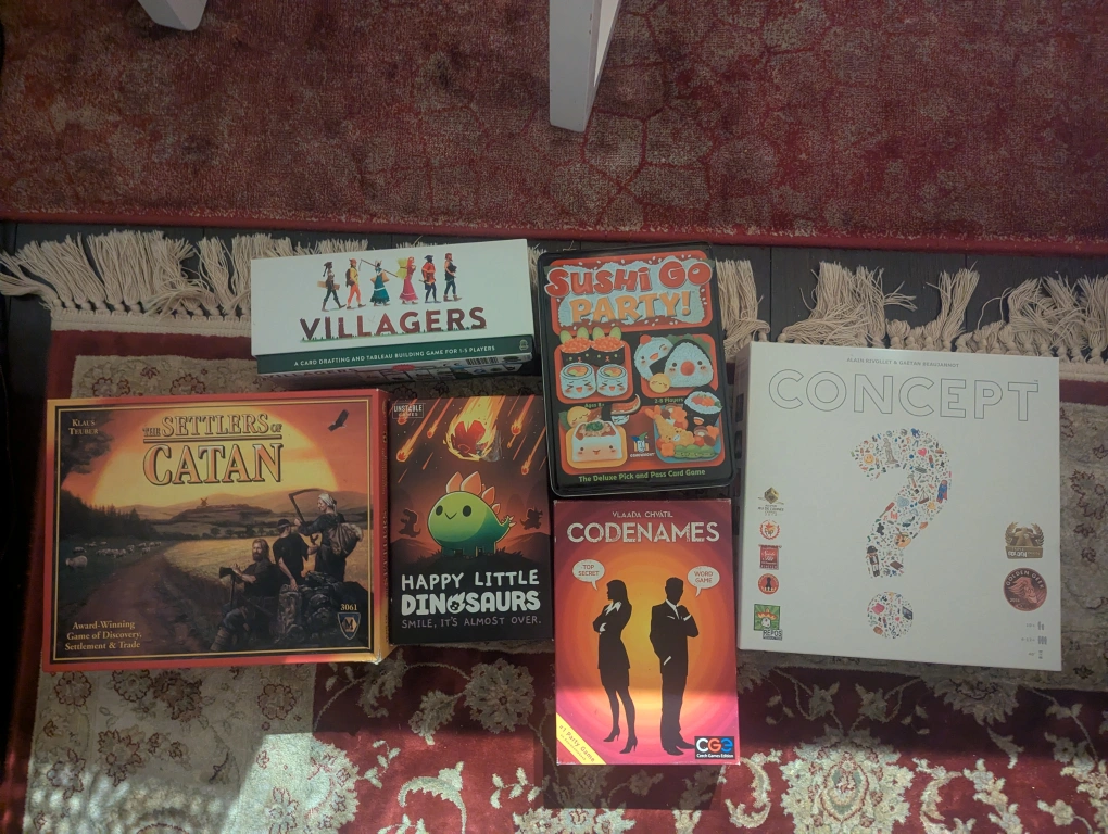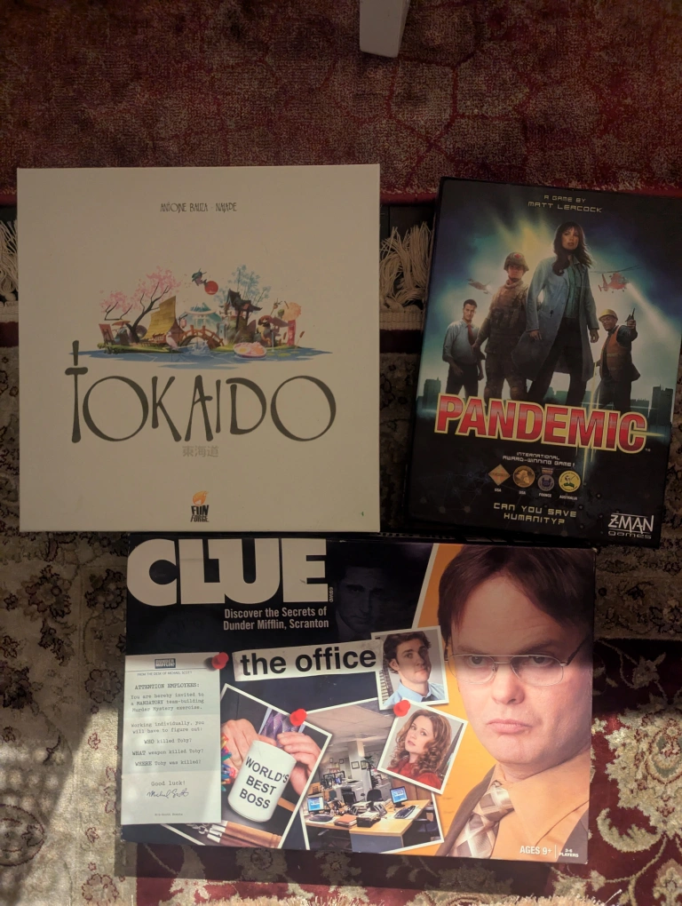 Large bundle of board games. Includes Tokaido, Pandemic, The Office-themed Clue, Settlers of Catan, Villagers, Sushi Go Party, Happy Little Dinosaurs, and Concept. Great for game nights or gifting. Pre-owned, but in good condition.